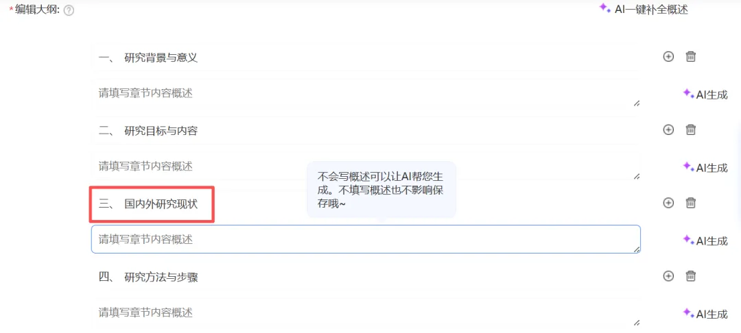 要是你想重点突出某个方向,比如国外某类技术的最新应用、某类理论的发展脉络,也能自己输入大纲,或者修改ai生成的大纲。