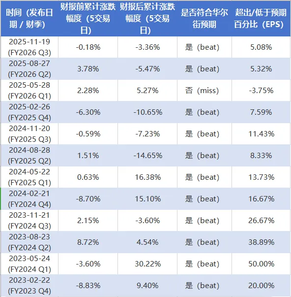 首先强调,本篇文章仅作为个人锻炼思维分析能力写的,不构成任何投资观点和建议,欢迎讨论直接上图:英伟达过去12次财报中,11次都能beat华尔街EPS预期(仅2025年5月miss),但股价反应高度分化——post 5天正收益仅6次,负收益6次,平均post反应波动大(历史“sell the news”或guidance主导常见)。Pre 5天多为小幅正/负,显示AI主题下提前定价但不确定性高。1.英伟达的股价大涨通常伴随新亮点叙事来驱动:大beat(如2023年超出预期+20%~50%)常伴随post大涨(+9%~+30%),反映市场对AI增长超预期的奖励。2.业绩超预期也不代表英伟达不会回调:即使beat,post常出现回调(如最近多次-3%~-14%),因高估值下指引未超预期或宏观影响放大。仅1次miss仍录得正post,总体股价显示基本面韧性。在2025年的谷歌、阿里等大厂开始自研芯片后,在业绩层面上英伟达很难在这次财报中大超预期。但是,在过去唯一一次EPS不及华尔街共识(25年5月28日FY2026 Q1)情况下,根本原因是美国政府4月9日突然要求H20芯片对华出口需新许可证,导致需求骤减、45亿美元H20超额库存及采购承诺计提一次性费用,直接拖累non-GAAP毛利率至61.0%(排除费用后为71.3%),EPS若排除该费用及相关税项则为$0.96(高于多数调整后共识$0.93)。营收仍超预期($44.06B vs $43.31B,beat 2.67%),数据中心仍增长73%,但费用一次性冲击使整体被视为“miss”。英伟达跌到90-100美金/股后在1年内重新站到了180美金附近,就算失去了中国市场也依旧被资本认可未来价值。3.关注Blackwell以及下个月的GTC:华尔街资本向来更关注企业的未来预期,而不是仅仅过去这一次的表现,所以更多的是关注未来产品路径和趋势,才能真正反映像英伟达这类AI公司的估值,作为硬件龙头,更多的是留在3月中旬举办的GTC 2026大会上,英伟达即将发布多款“全球首见”的全新芯片,2025年被TPU挑战后,英伟达是否需要在架构上进行调整以应对其他厂商崛起的势头,继续保持甚至加大市场份额。总结:预计此次财报略微超出预期指引,但股价在3月GTC大会前出现小部分回调,因为就近3个月的发展情况来看,中国市场还是没有开放(可能在中东市场有些亮点),英伟达的业绩不会大超预期,此外2026年华尔街对AI芯片的整体预期上目前来看还是悲观的,目前在英伟达股票上只能等待新品发布后提振,可能3-4月会创新高(个人猜测,不代表投资指引)。