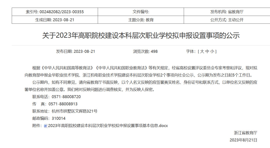 最新消息,2023年8月21日浙江省教育厅发布一则公示,“关于2023年高职院校建设本科层次职业学校拟申报设置事项的公示”