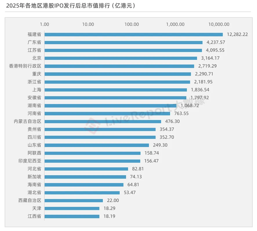 发行市值排名前三的地区分别为福建省、广东省及江苏省,发行后总市值分别为1.23万亿、4237亿及4095亿港元。福建省大幅领先,广东省与江苏省差距不大,其他地区的发行市值依次为递进关系。
