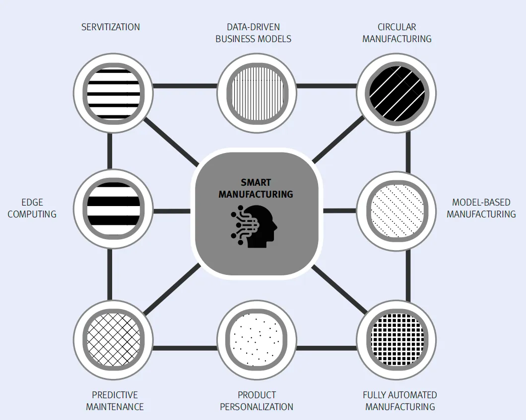 循环制造 — 利用退役产品信息,实现多生命周期闭环 数据驱动的商业模式 — 基于数据定制商业策略 基于模型的制造 — 3D模型作为全生命周期权威信息源 全自动化工厂(黑灯工厂)— 人类工人成为"可选" 产品个性化 — 为正确的人在正确的时间制造正确产品 预测性维护 — 在故障发生前主动干预 边缘计算 — 实时控制下沉到设备边缘 服务化转型 — 卖产品结果而非产品本身