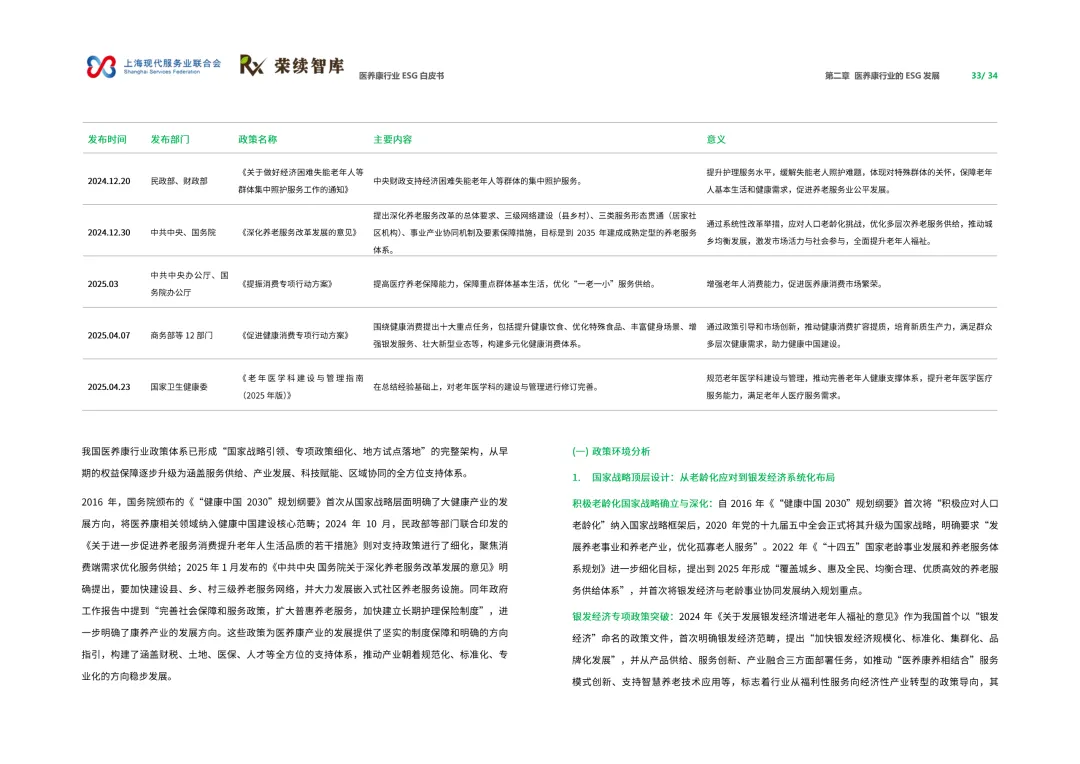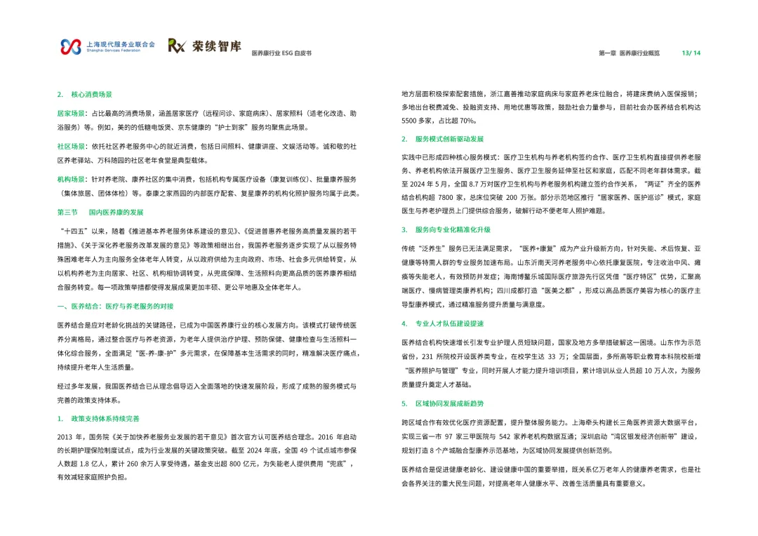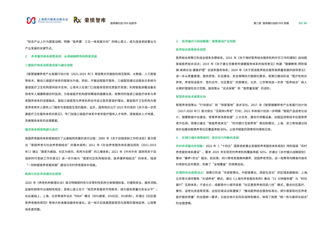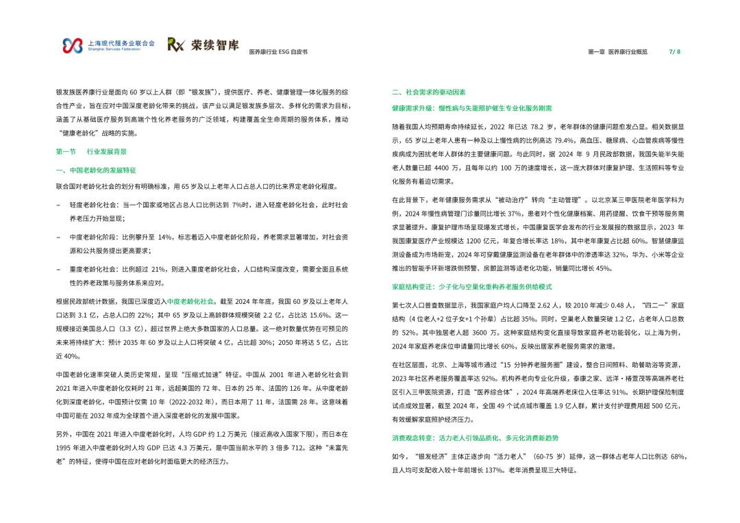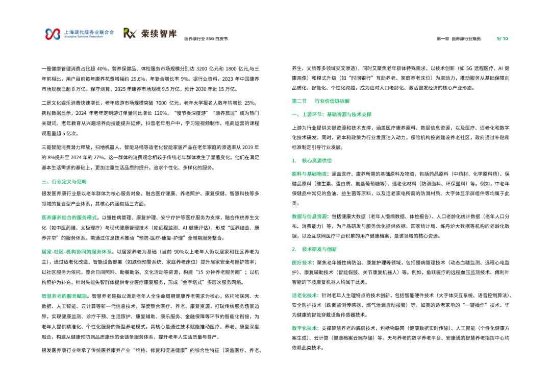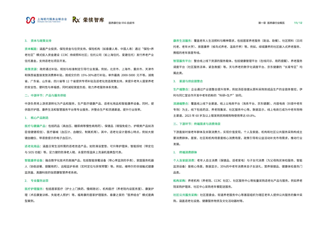 来源:上海现代服务业联合会与荣续 ESG 智库联合报告聚焦人口老龄化与健康中国战略背景,系统呈现行业可持续发展全景。白皮书涵盖行业概览、ESG 发展、细分领域及优秀实践四大核心板块,解析行业发展背景、价值链构成与国内外发展路径,梳理国内外相关政策支持体系。ESG 维度聚焦环境绿色转型、社会服务普惠、治理规范透明三大核心议题,环境端推进低碳运营与废物循环,社会端强化服务质量与健康公平,治理端完善伦理管理与数据安全。细分领域涵盖医药制造、诊疗护理、适老化改造、智慧养老,展现多元发展态势。白皮书收录翔宇医疗、华润三九等标杆企业实践案例,提炼可复制的行动经验,为政策制定者、产业经营者提供决策依据与行动路径,助力构建更具韧性与温度的医养康生态,推动产业价值与社会价值深度融合。回复【9999】→10+行业政策汇编