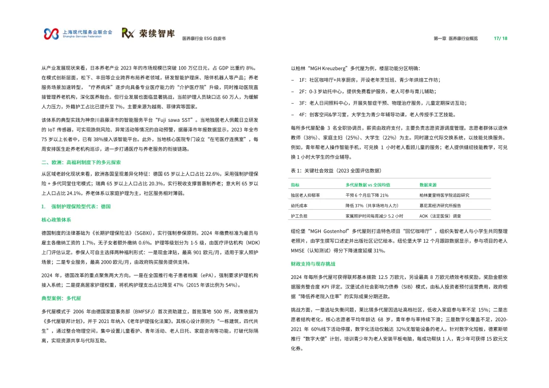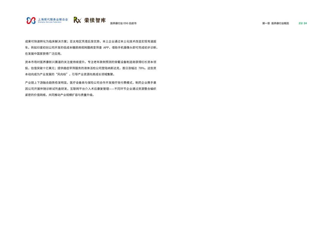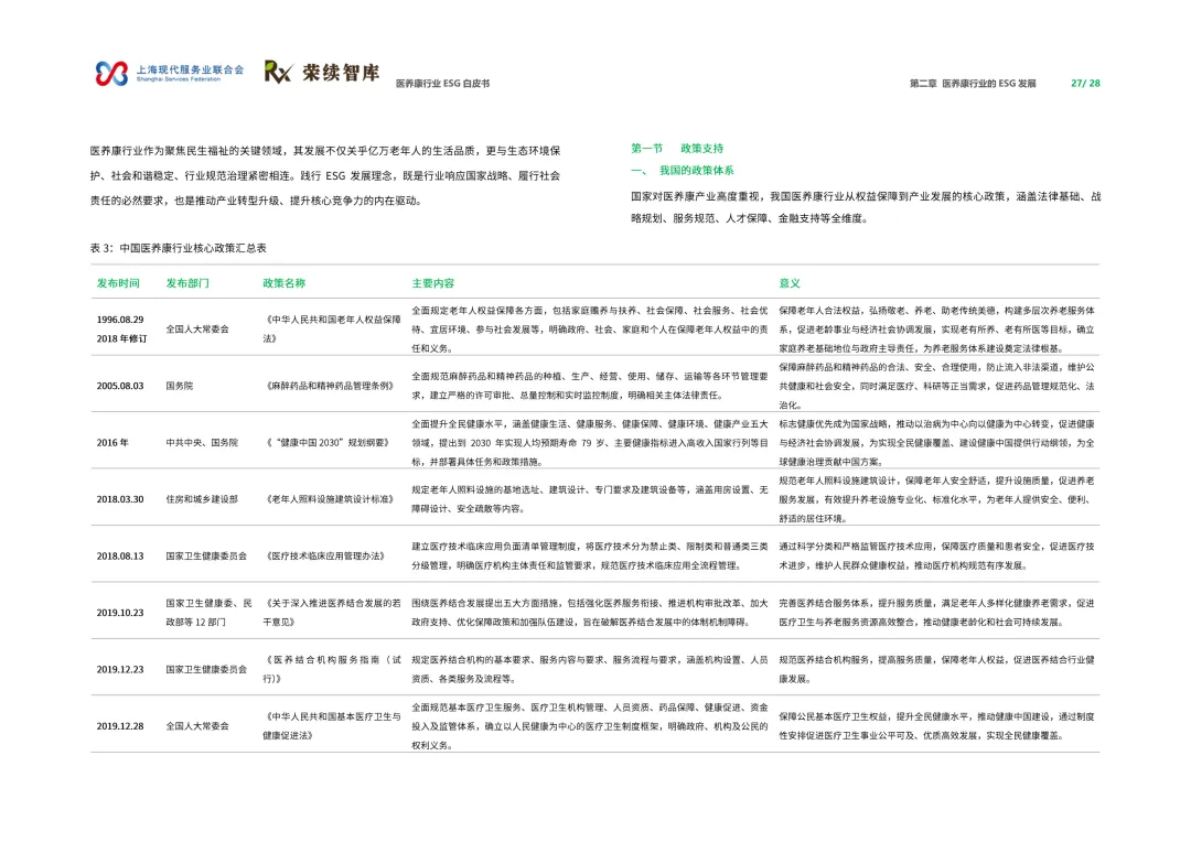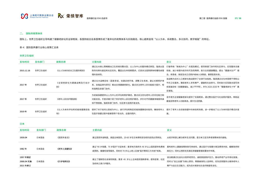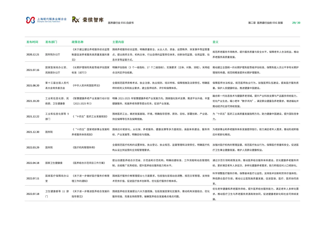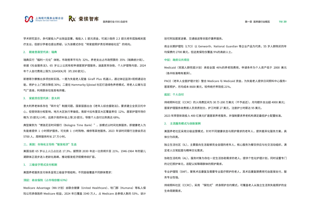来源:上海现代服务业联合会与荣续 ESG 智库联合报告聚焦人口老龄化与健康中国战略背景,系统呈现行业可持续发展全景。白皮书涵盖行业概览、ESG 发展、细分领域及优秀实践四大核心板块,解析行业发展背景、价值链构成与国内外发展路径,梳理国内外相关政策支持体系。ESG 维度聚焦环境绿色转型、社会服务普惠、治理规范透明三大核心议题,环境端推进低碳运营与废物循环,社会端强化服务质量与健康公平,治理端完善伦理管理与数据安全。细分领域涵盖医药制造、诊疗护理、适老化改造、智慧养老,展现多元发展态势。白皮书收录翔宇医疗、华润三九等标杆企业实践案例,提炼可复制的行动经验,为政策制定者、产业经营者提供决策依据与行动路径,助力构建更具韧性与温度的医养康生态,推动产业价值与社会价值深度融合。回复【9999】→10+行业政策汇编