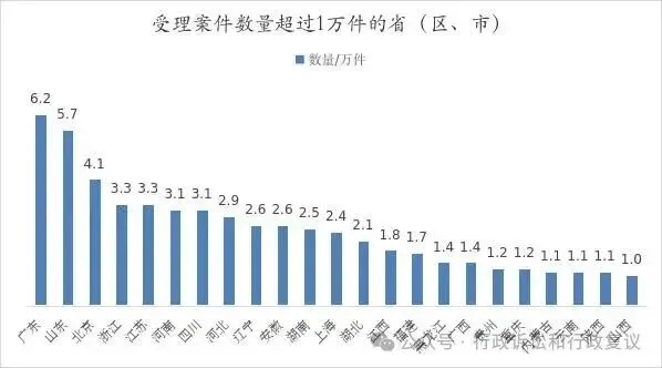 从层级分布上看,近九成(89.4%)的案件由市县两级人民政府立案受理。县级政府受理37.4万件,占57.7%;市级政府受理20.6万件,占31.7%;省级政府3.1万件,占4.8%;实行垂直领导的行政机关2.9万件,占4.5%。