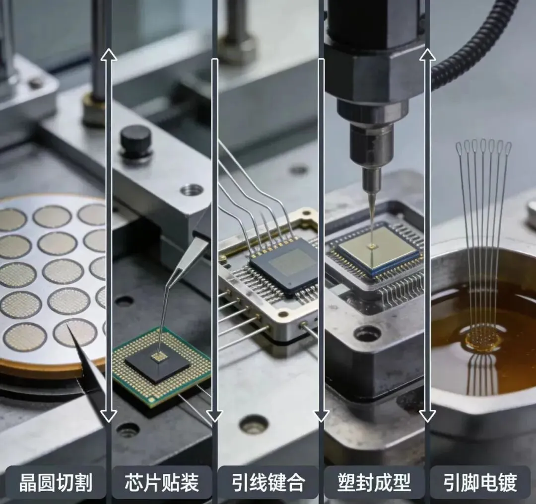 (3)塑封成型:通过注塑成型工艺,将熔融状态下的塑料注入模具中包裹住芯片及引线,固化后形成坚固的保护壳。