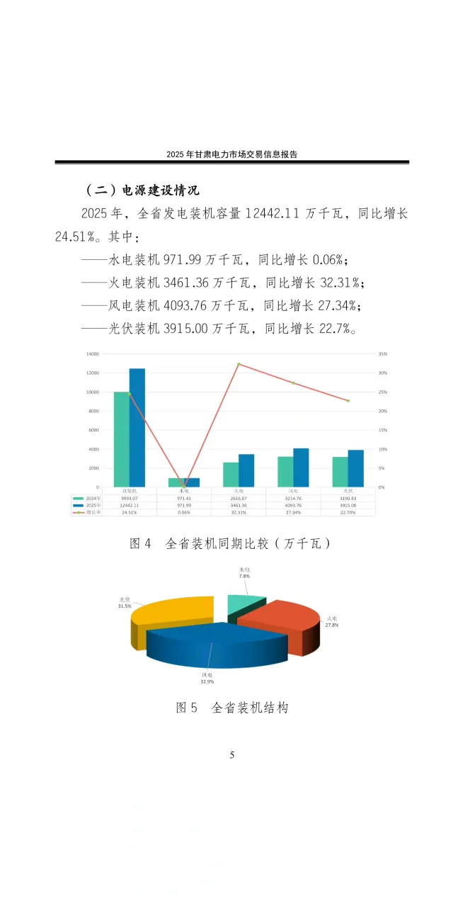 截至2025年12月,甘肃发电装机容量12442.11万千瓦,其中火电装机3461.36千瓦、水电装机971.99万千瓦,风电装机4093.76万千瓦,太阳能发电装机3915.00万千瓦。储能装机容量790.58万千瓦,其中网侧独立及共享储能合计占比约1/3。2025年1-12月份新增并网发电装机容量2449.04万千瓦,其中风电光伏装机容量新增1603.17万千瓦。新增新型储能349.08万千瓦。