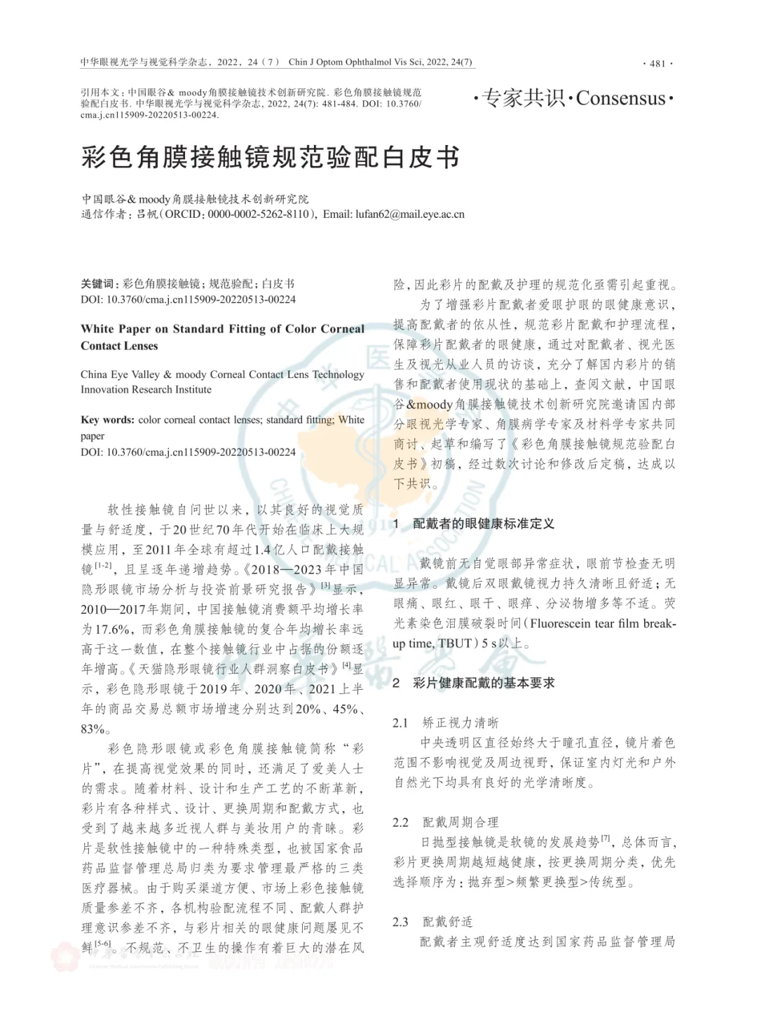 引用本文:中国眼谷& moody角膜接触镜技术创新研究院. 彩色角膜接触镜规范验配白皮书[J]. 中华眼视光学与视觉科学杂志,2022,24(07):481-484. DOI:10.3760/cma.j.cn115909-20220513-00224.