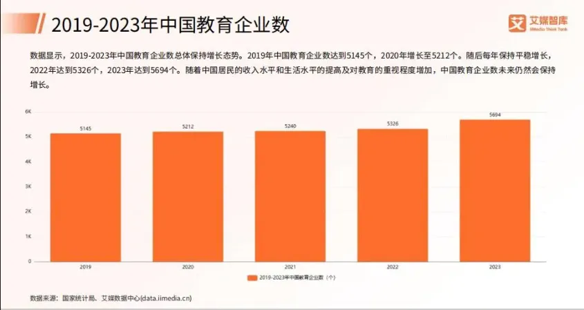 数据显示,2019-2023年中国教育企业数总体保持增长态势。2019年中国教育企业数达到5145个,2020年增长至5212个。随后每年保持平稳增长,2022年达到5326个,2023年达到5694个。随着中国居民的收入水平和生活水平的提高及对教育的重视程度增加,中国教育企业数未来仍然会保持增长。