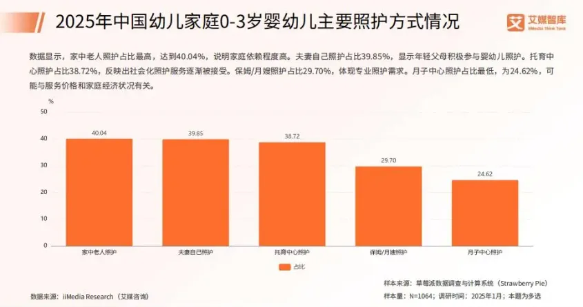 艾媒智库IMedin Think Tank 数据显示,家中老人照护占比最高,达到40.04%,说明家庭依赖程度高。夫妻自己照护占比39.85%,显示年轻父母积极参与婴幼儿照护。托育中心照护占比38.72%,反映出社会化照护服务逐渐被接受。保姆/月嫂照护占比29.70%,体现专业照护需求。月子中心照护占比最低,为24.62%,可能与服务价格和家庭经济状况有关。
