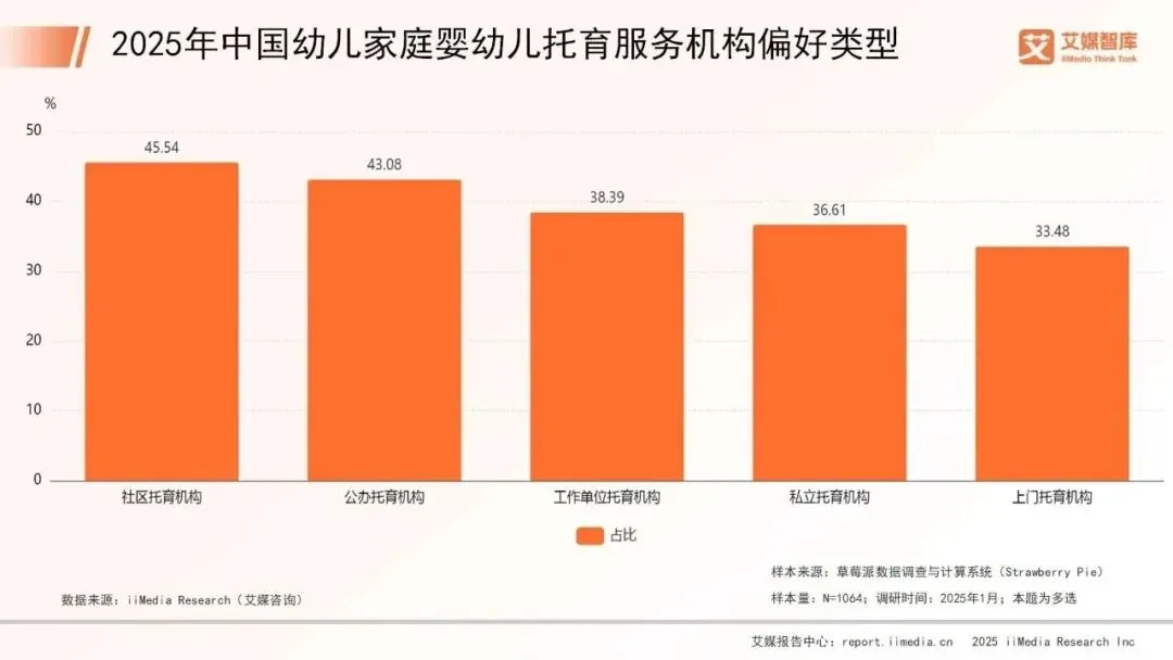 社区托育:45.54%(主流) 公办托育:43.08% 民办连锁:38.39% 早教中心附属:26.79% 家庭式托育:17.86%