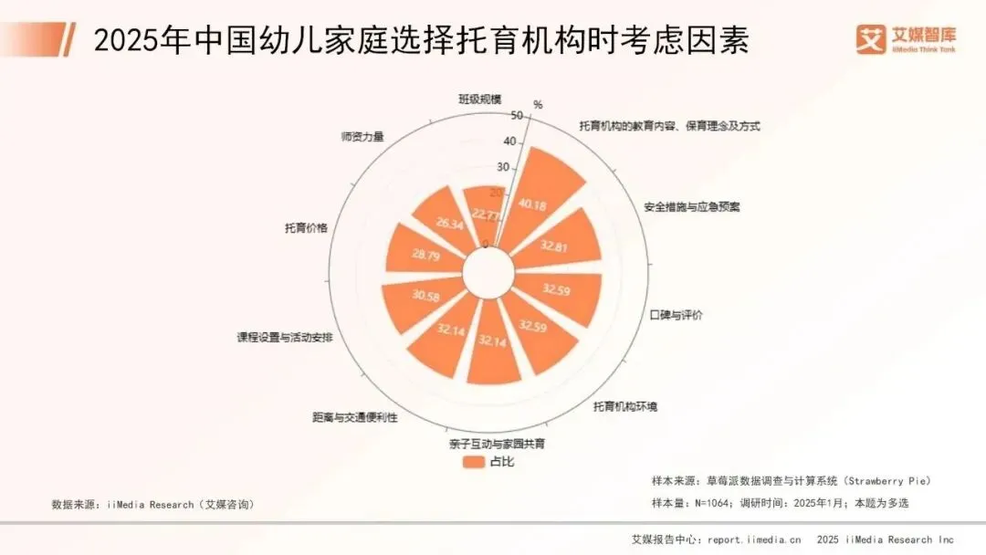 1)教育内容、保育理念及方式:40.18%(最核心) 2)安全措施与应急预案:32.81% 3)口碑评价、机构环境:32.59% 4)亲子互动 / 家园共育、距离 / 交通:32.14% 5)课程设置:30.58% 6)托育价格:28.79% 7)师资力量:26.34% 8)班级规模:22.77% 9)餐食营养、卫生条件:21.43% 10)品牌知名度:19.64%