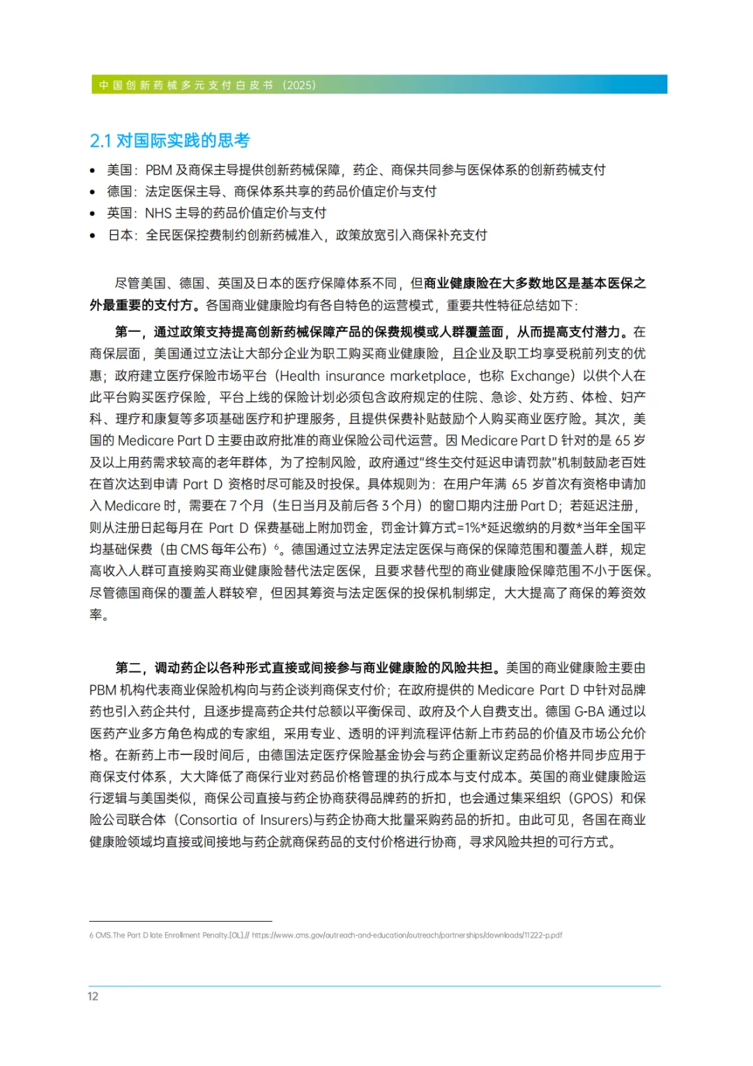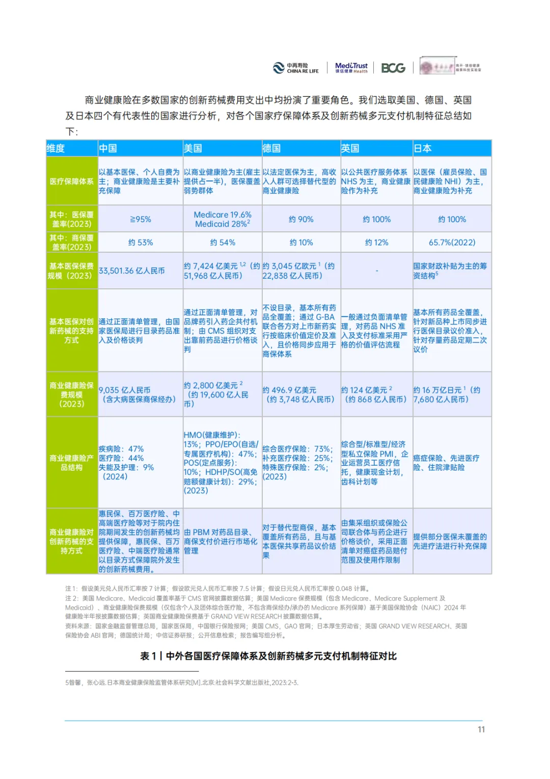 报告选取美国、德国、英国、日本四大市场进行横向对比,提炼出其创新药械多元支付体系的三条核心规律:其一,除社会保险(保障)外,商业健康险均是各个市场创新药械多元支付方中最主要的支付主体;其二,在商保支付中,创新药械产业深度协同保险行业构建风险共担机制,提升商保支付效率和可持续性;其三,商保目录是连接保险行业和药企的重要纽带,有效管理了商保的成本和价格,是促成药企参与风险共担的抓手。