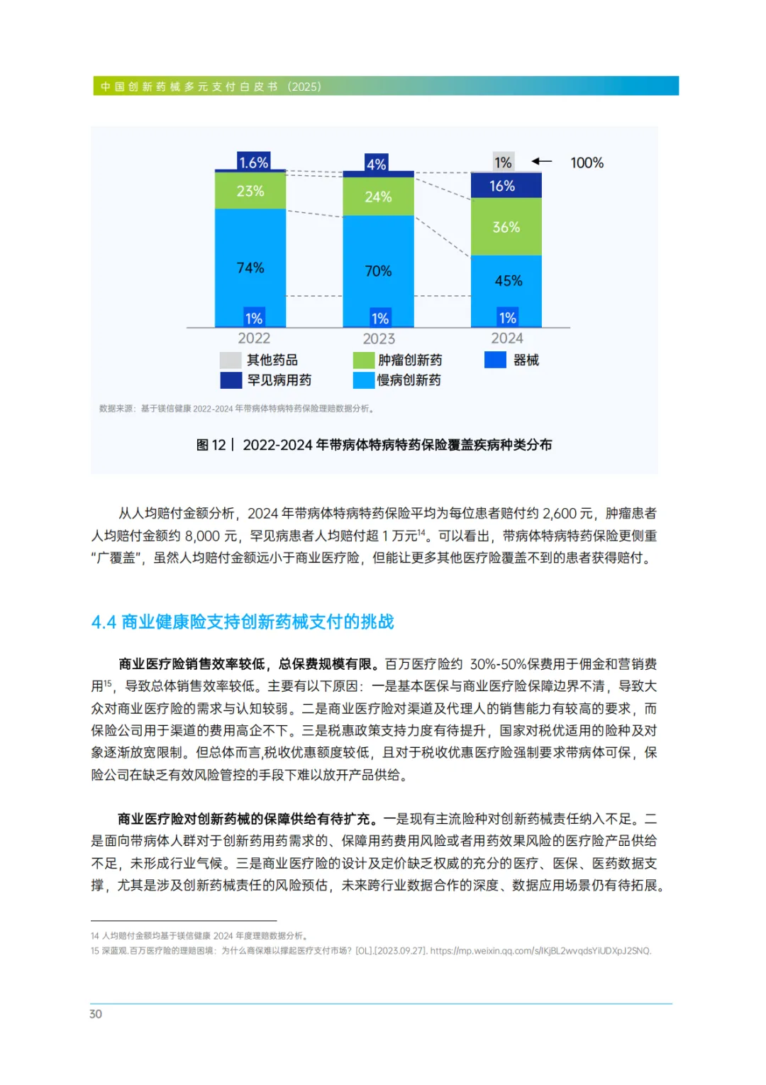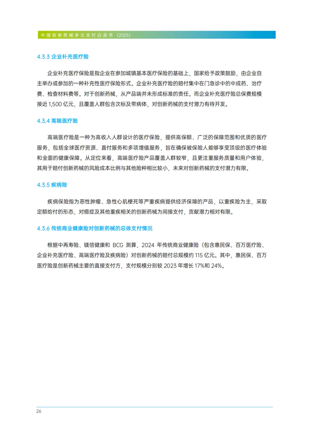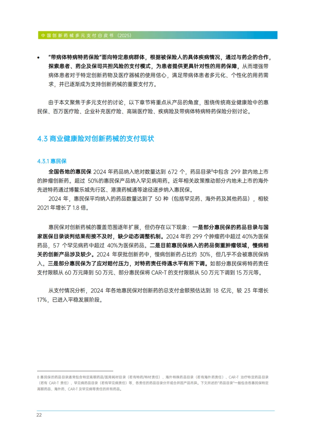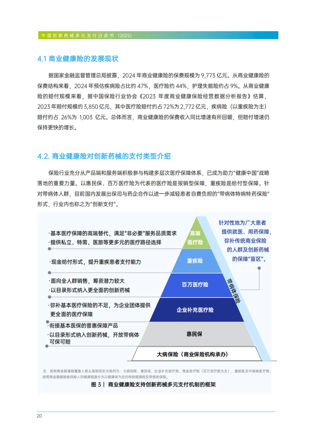 创新药械对患者、医疗卫生系统及社会均可以带来多重价值。目前,在社会医疗保险之外,形成了以市场化运作的商业健康险为主的有效降低个人自费负担的多元支付机制,主要包含惠民保、百万医疗险、企业补充医疗险、中高端医疗险、带病体特病特药保险及重疾险等。