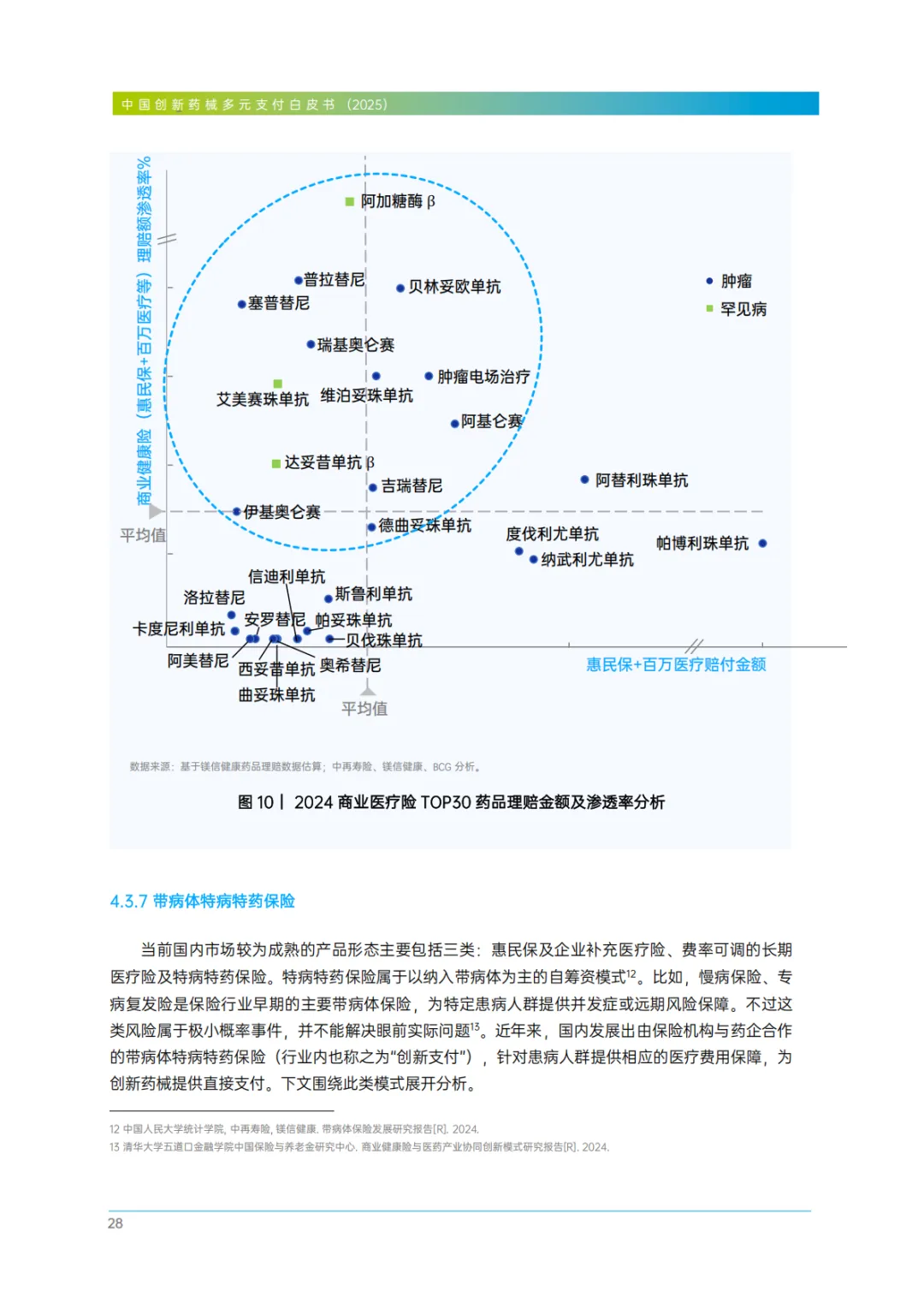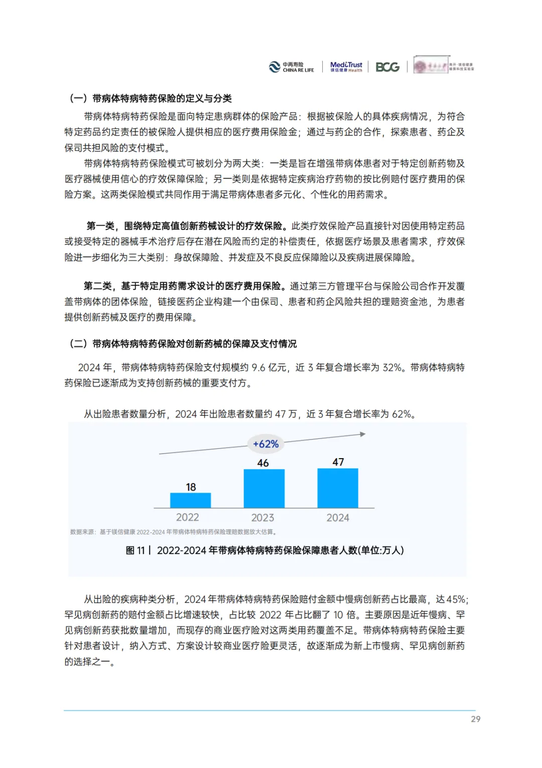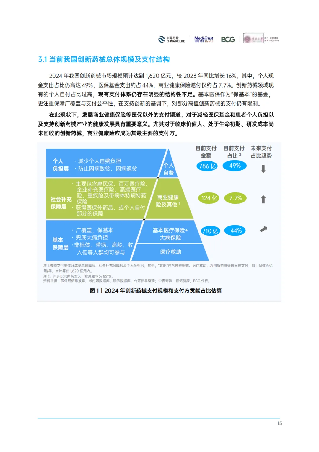 创新药械对患者、医疗卫生系统及社会均可以带来多重价值。目前,在社会医疗保险之外,形成了以市场化运作的商业健康险为主的有效降低个人自费负担的多元支付机制,主要包含惠民保、百万医疗险、企业补充医疗险、中高端医疗险、带病体特病特药保险及重疾险等。