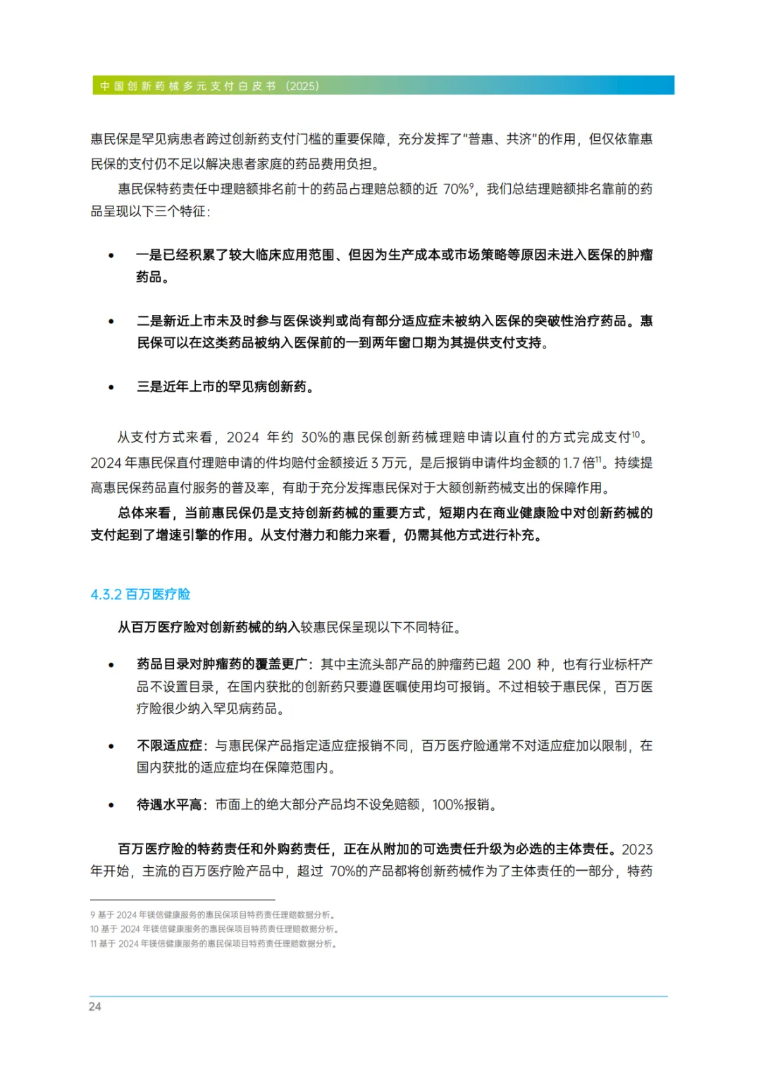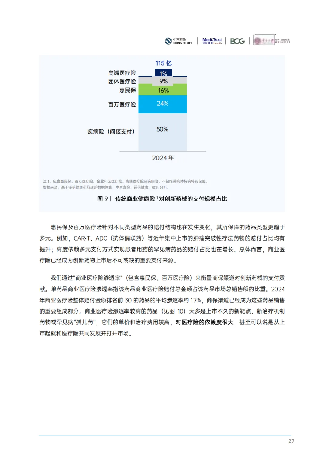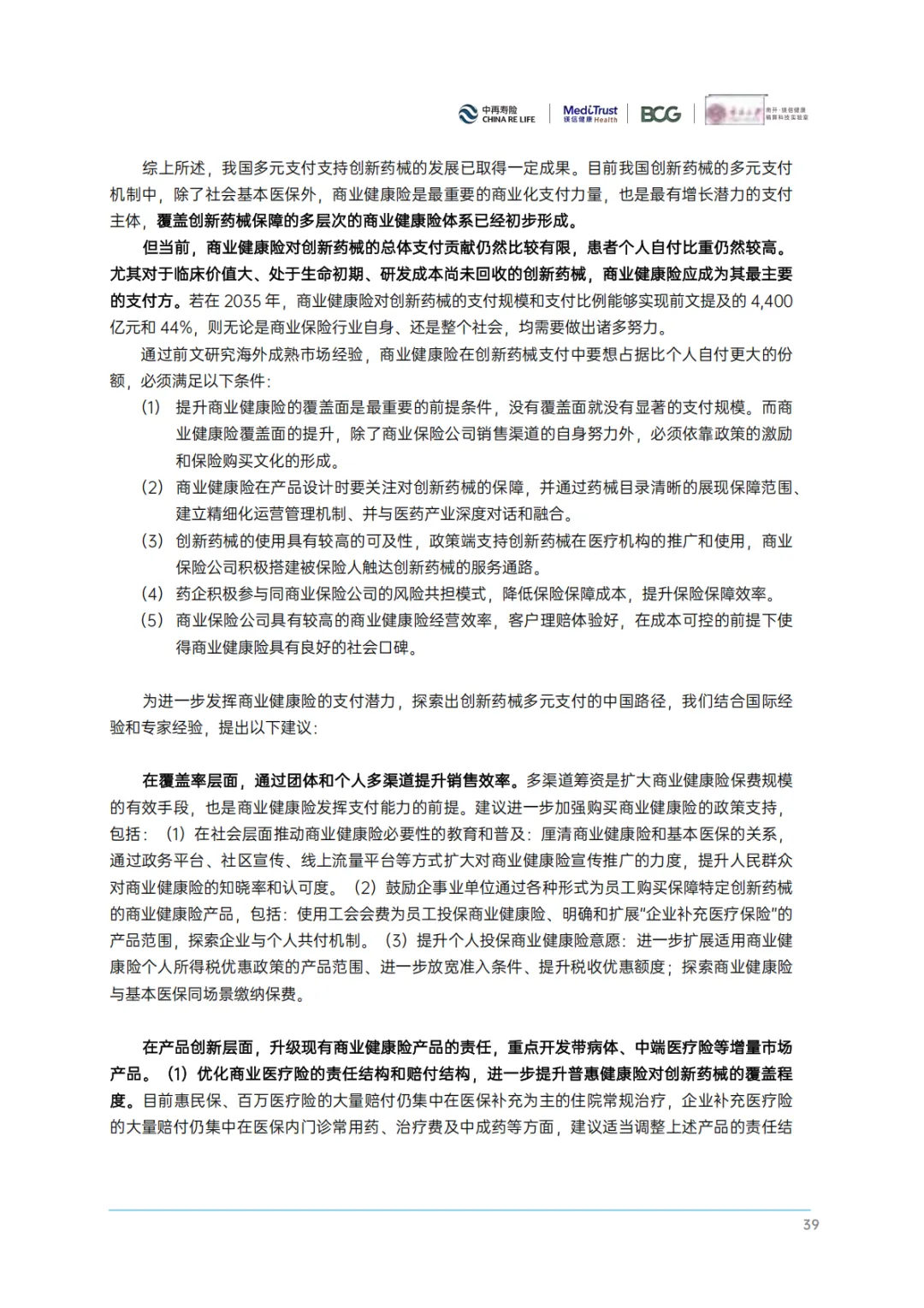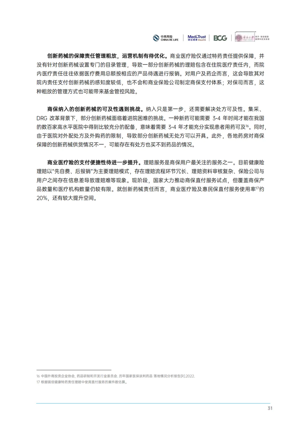 创新药械对患者、医疗卫生系统及社会均可以带来多重价值。目前,在社会医疗保险之外,形成了以市场化运作的商业健康险为主的有效降低个人自费负担的多元支付机制,主要包含惠民保、百万医疗险、企业补充医疗险、中高端医疗险、带病体特病特药保险及重疾险等。