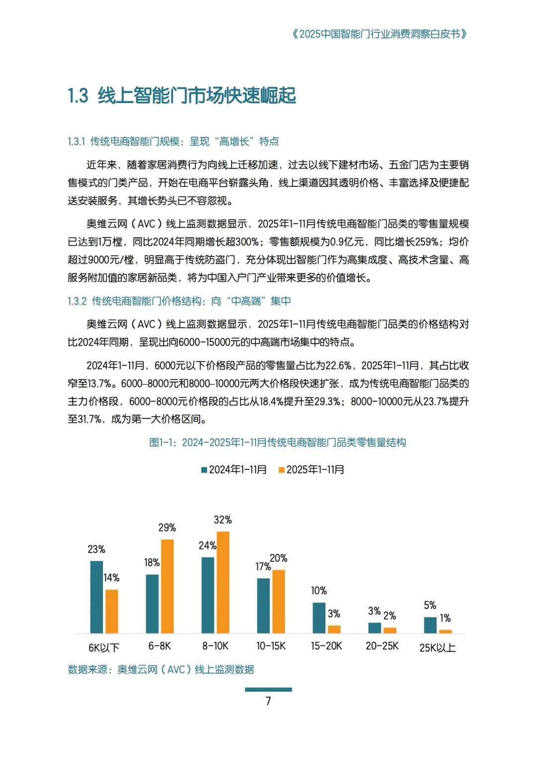 线上渠道成为智能门市场增长核心引擎,2025 年 1-11 月传统电商零售量同比增长超 300%,价格结构向 6000-15000 元中高端集中。用户购前信息获取以电商平台、直播、短视频为主,最信任电商平台与线下门店体验,关注产品功能配置、质量安全及售后服务,产品质量与安全等级是最终购买的决定性因素,已购用户主流消费区间为 3000-6000 元,潜在用户预算则向中高端上移。