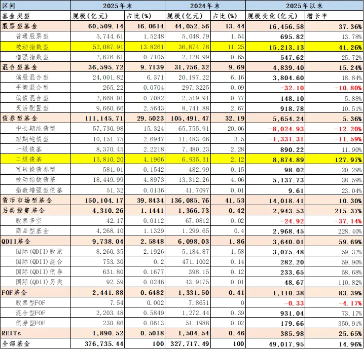 从增长角度来看,股票型基金规模较2024年底上涨幅度和规模最大,上涨了1.65万亿,上涨比例37.36%,主要规模来源于被动指数基金,上涨了1.52万亿。货币基金上涨规模排第二位,规模增长1.40万亿,增长幅度10.30%。而债券型基金规模较2024年底增长5654.24亿,增幅比例仅为5.36%。从二级分类来看,中长期纯债、短期纯债基金在2025年均下降超过10%,分别规模下降8024.93亿、1331.31亿;债券型基金的规模增长来源主要来源于二级债基与债券指数型基金,分别规模增长8874.89亿、5137.73亿,增长幅度达到了127.97%、38.59%。另外,另类投资基金、FOF基金、QDII基金也在2025年取得规模的显著增长,分别增长率215.37%、83.39%、59.69%。