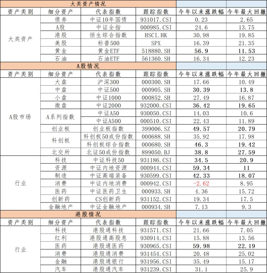 A股市场中,代表成长风格的中证500、代表小微盘的中证2000表现突出,涨幅分别为30.39%、36.42%;代表科技成长的创业板指数、科创板综合指数、北证50成份指数今年以来涨幅分别为49.57%、46.30%和38.80%,表现优秀;从行业来看,与AI算力、国产替代、新能源相关的有色金属、通信、电子、电力设备涨幅居前。相比之下,债券市场表现平淡,呈现震荡格局。
