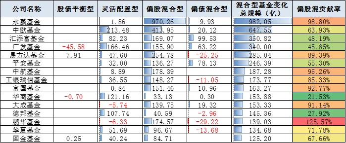 2025年混合型基金规模增长超过100亿的基金公司共有15家,其中偏股混规模贡献占比超过85%的共有7家。变化规模TOP1为2025年在权益基金上表现亮眼的永赢基金,合计增长982.05亿,接近98.80%的规模均来自于偏股混合型。第二名的为中欧基金,合计增长647.55亿,其中63.93%的贡献来自于偏股混合型基金,另外的部分来自于灵活配置混合型。汇添富、广发、平安除偏股混贡献较大外,灵活配置混合型、偏债混合型(固收+)贡献同样占有一定比例。其中、德邦、华商的规模增长主要来自于灵活配置混合型,与其它基金公司不同,且这两家公司灵配产品的策略上也不尽相同。