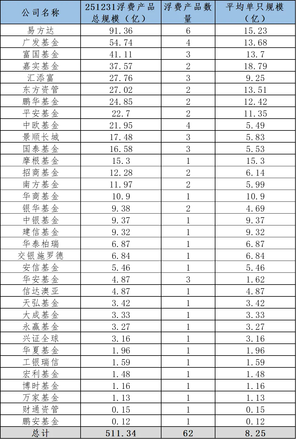 2025年浮动管理费产品问世,该类产品年内合计发行62只,涉及管理人34家。其中,发行浮动管理费产品最多、规模最大的管理任均为易方达基金。发行2只及以上的基金管理人共有15家。