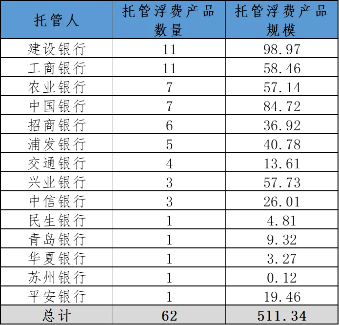 托管人来看,共涉及14家托管行,其中建行、工行托管浮动管理费产品最多,均为11只。托管规模目前最大的为建行,接近100亿为98.97亿。