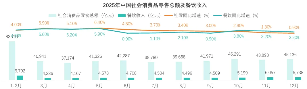 ⦁ 2025年餐饮收入约5.8万亿元,占社会消费品零售总额的11.6%,同比增长3.2%。虽然增速略低于大盘,但在消费趋稳的背景下,餐饮依然是服务型消费的重要支柱。