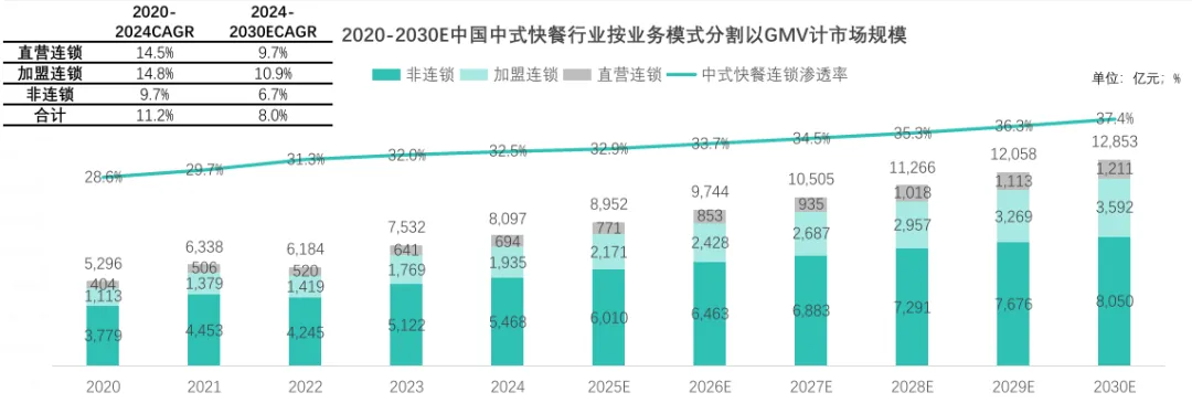 ⦁ 中式快餐连锁渗透率从2020年的28.6%升至2024年的32.5%,但仍远低于西式快餐的67.9%,未来仍有较大提升空间。加盟模式增速最快,预计到2030年GMV将达3592亿元。