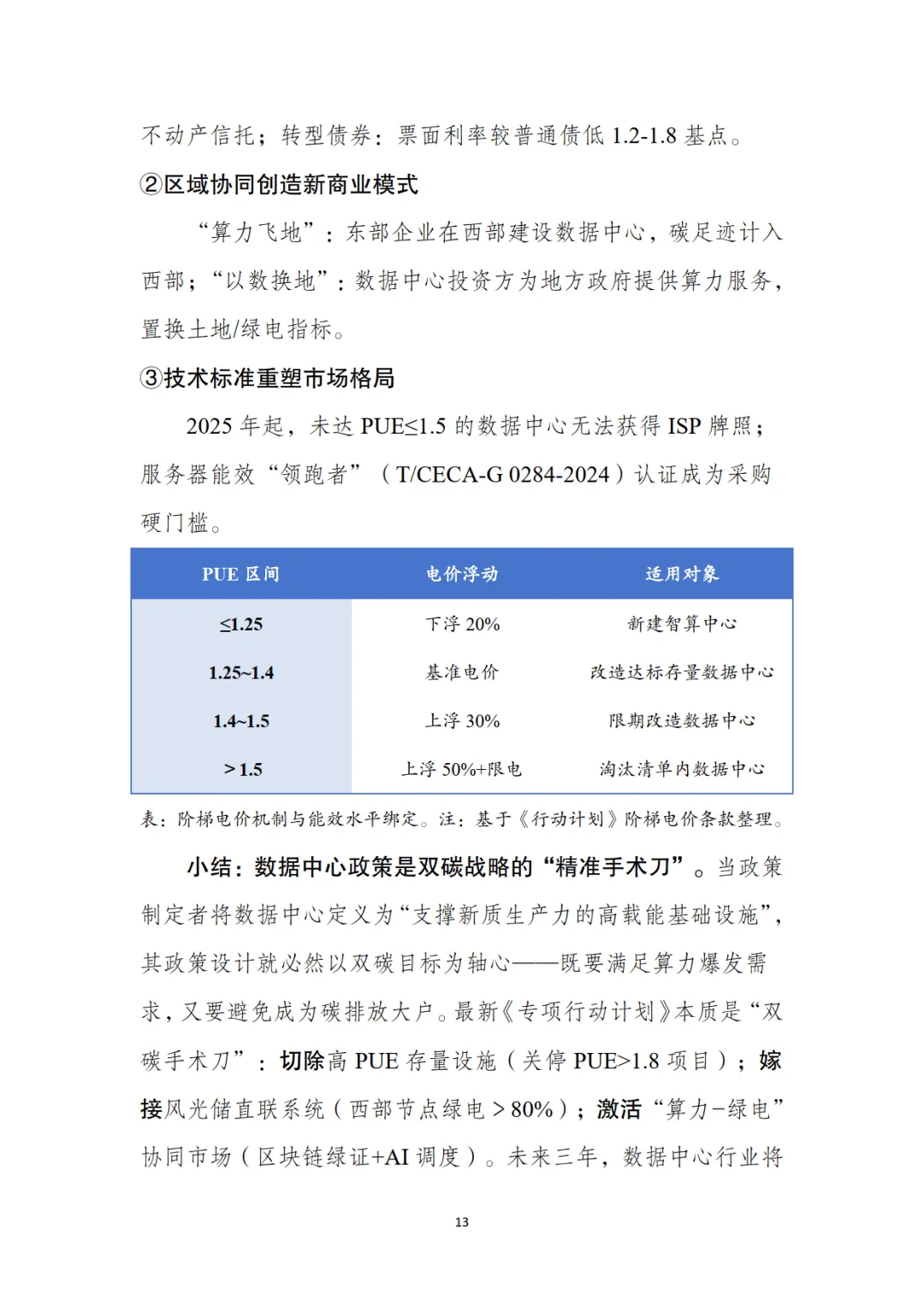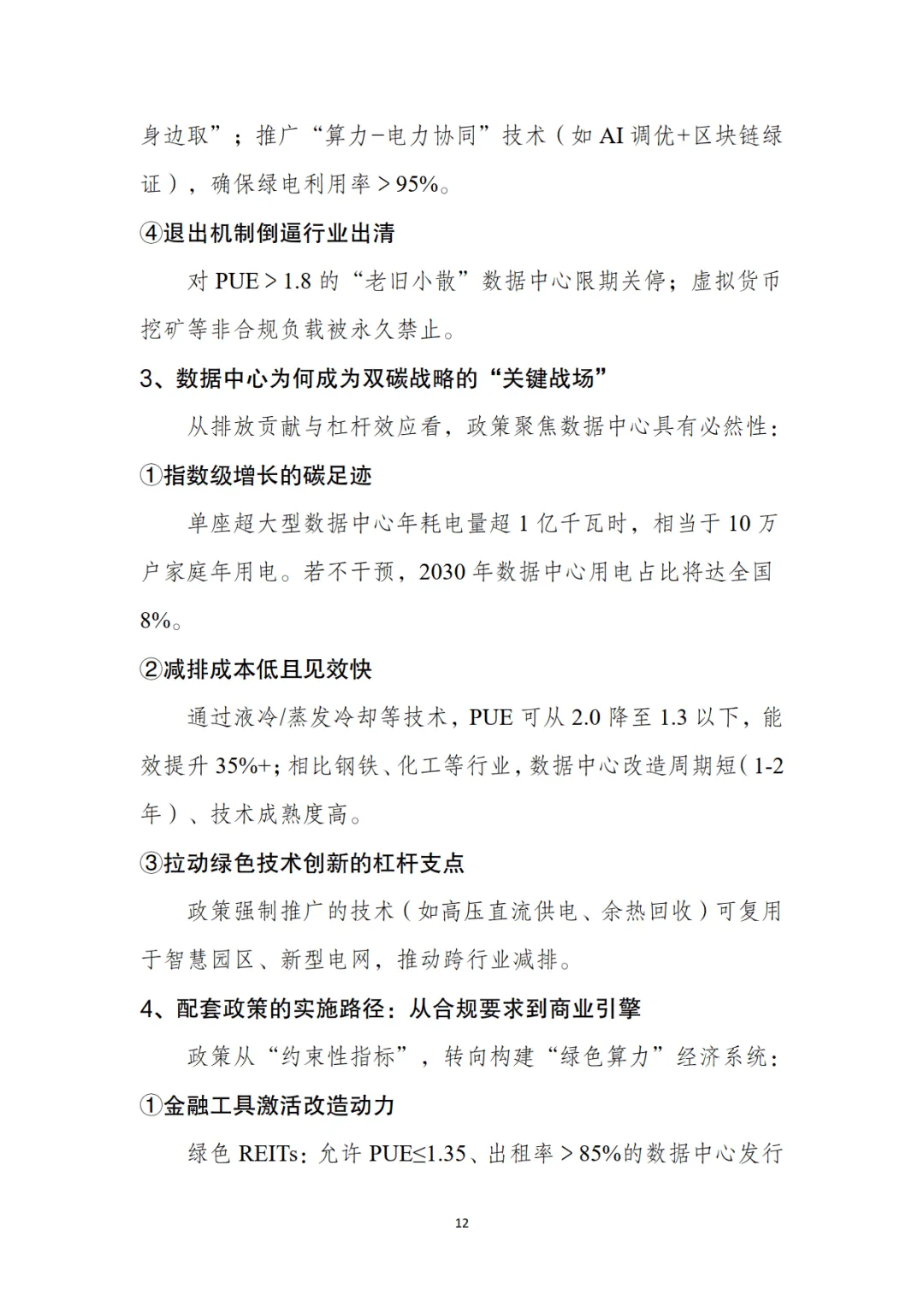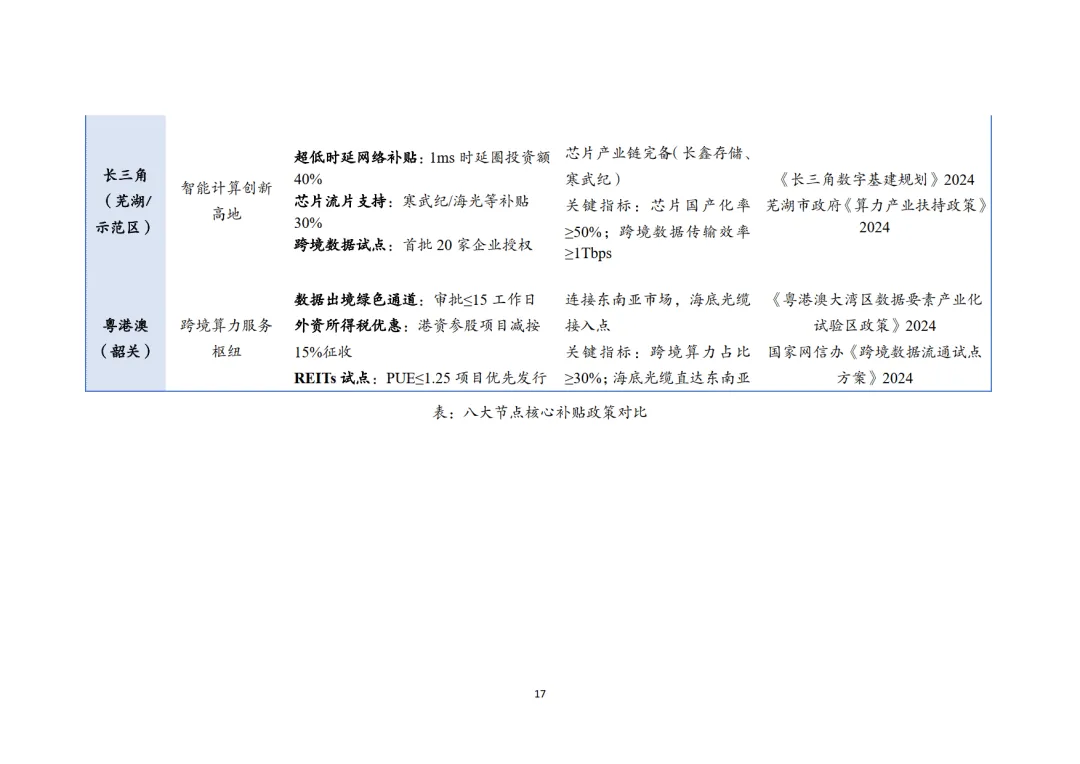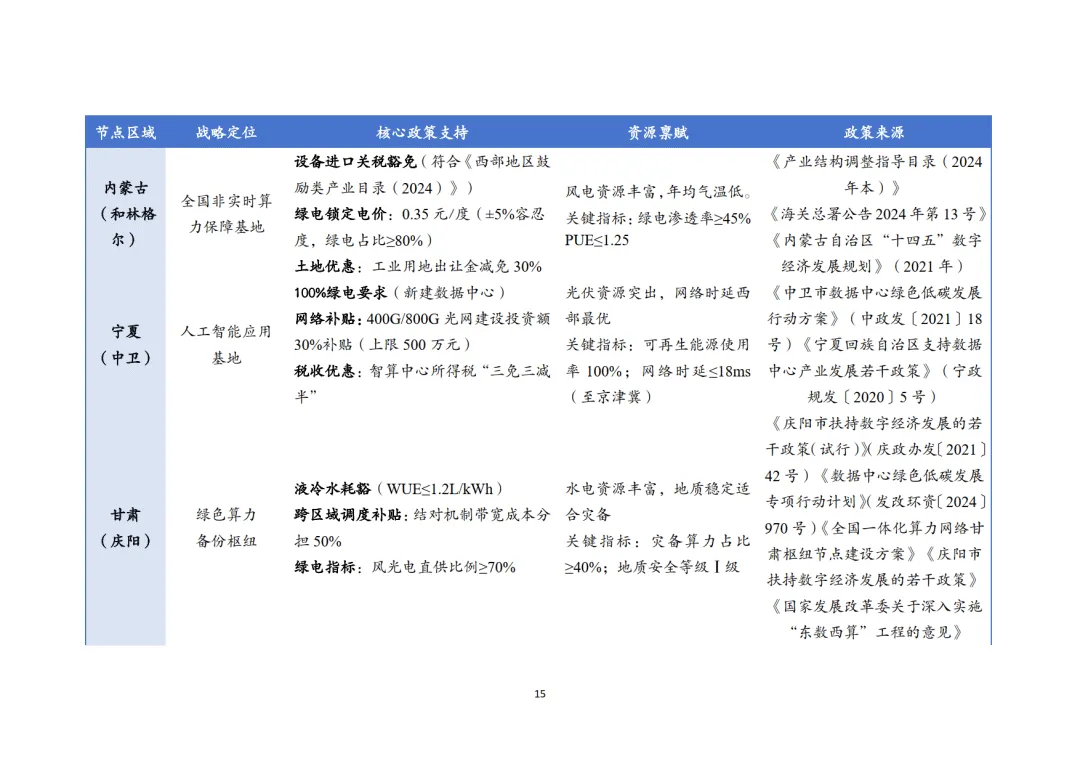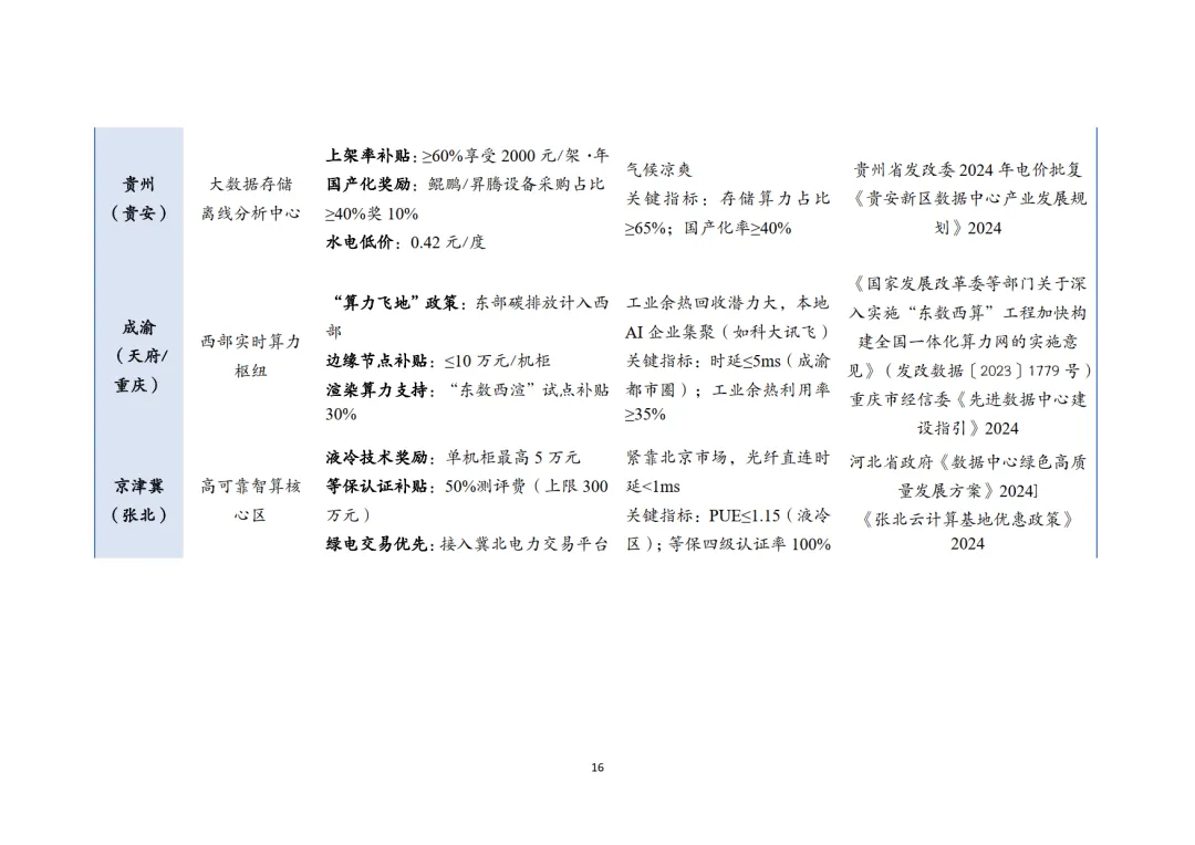 绿色数据中心作为双碳战略关键配套,政策体系围绕强制能效管控、可再生能源配额、空间布局绑定三大核心展开。2025 年国家枢纽节点新建数据中心 PUE≤1.25、绿电占比≥80%,存量改造后 PUE≤1.5,阶梯电价机制对高 PUE 项目实施惩罚性收费。八大枢纽节点形成差异化政策矩阵,西部节点(内蒙古、宁夏等)侧重绿电直供与电价优惠,东部节点(长三角、粤港澳)聚焦低时延网络与跨境算力支持,叠加智算中心专项补贴、国产化奖励等激励政策,构建起 "合规要求 + 商业引擎" 的政策实施路径。