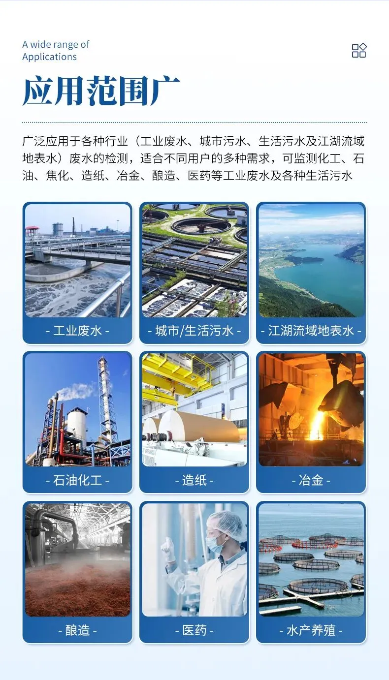 工业废水: 焦化、造纸、电镀、制药、化工、印染、食品加工等行业的废水处理过程监控和排放口检测。