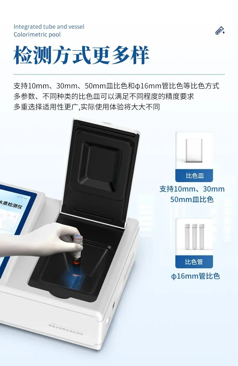 HM-TNO3: 采用精密比色池设计,支持多元比色方式,包括φ16mm比色管以及10mm、30mm、50mm的比色皿,用户可根据样品浓度和检测需求灵活选择。