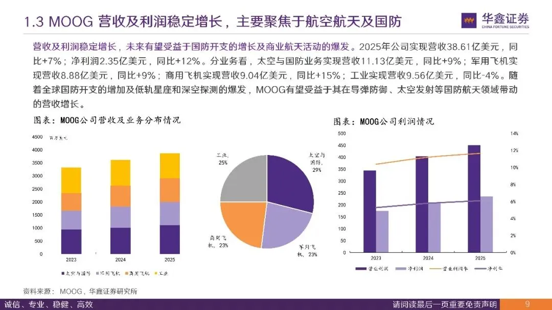 2025年公司实现营收38.61亿美元,同比+7%;净利润2.35亿美元,同比+12%。公司积极拓展商业航天领域,推出电机伺服矢量控制系统、卫星通用底盘、卫星拖车等产品。随着全球国防开支的增加及低轨星座和深空探测的爆发,MOOG有望受益于其在导弹防御、太空发射等国防航天领域领先技术带动的营收增长。