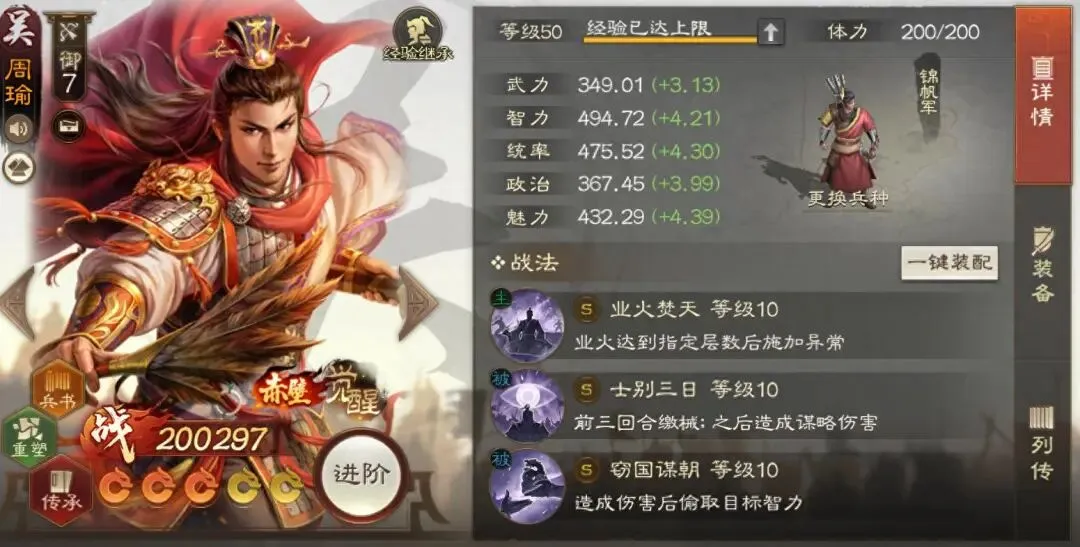 赤壁周瑜,经过测试服多次加强后,目前的强度应该是中上水平,有点像强化版的沮授,敌军没阵亡就可以开始传递【业火】,每回合结束都传,且初次达到5/10/15/20层都有特殊效果。