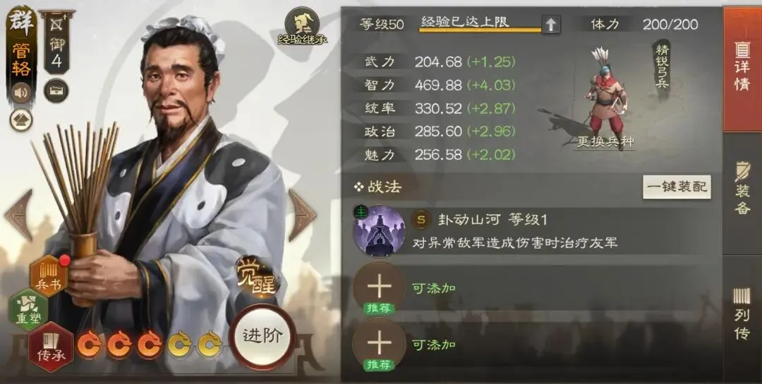 管辂,也是一个DOT类型的武将,自带16%谋略增伤,另外命中异常状态敌人能为我方兵力最低的回血,总体机制没什么问题,但是这个体系目前就没什么上场率,而且这个武将的DOT伤害连沮授的一半都没到,主打的是治疗,目测是7天赠送的武将。