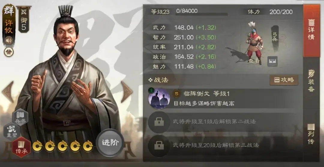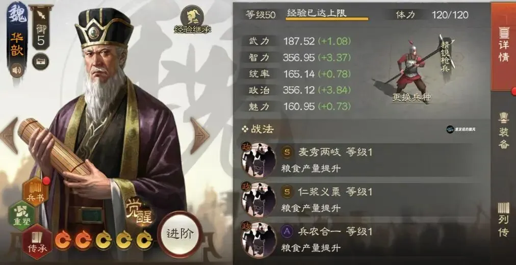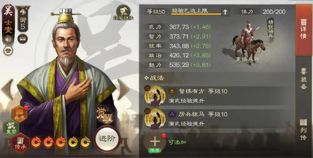 士燮,第二个提高演武经验的武将,对于开荒帮助很大,战法效果和张既是一样的,开张既的属性会比士燮更好,荒刷演武的时候可以让张既去主政厅,士燮当演武使。