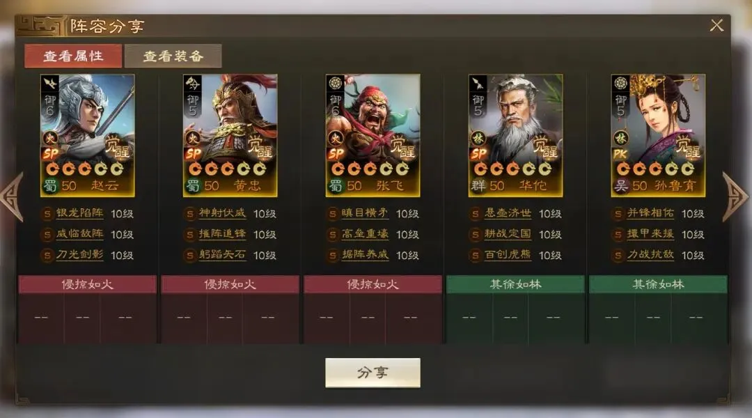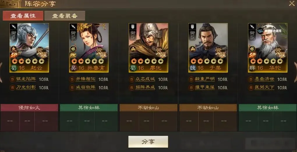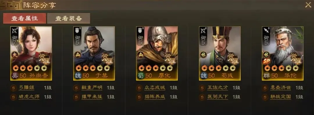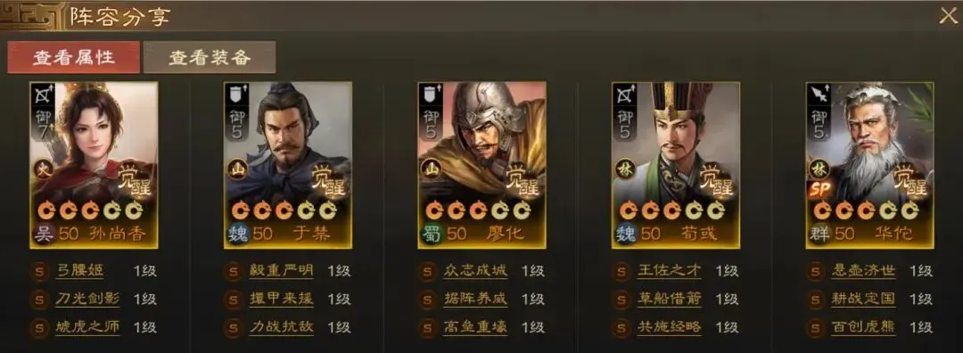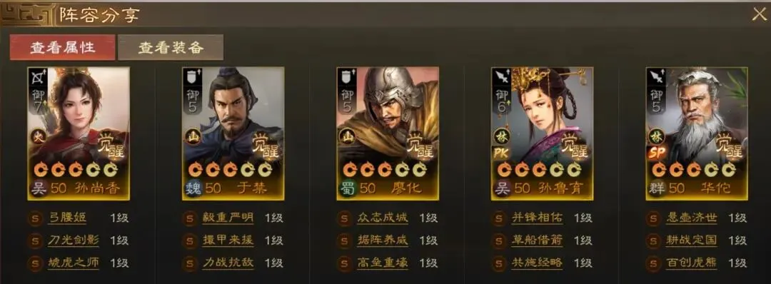 孙尚香(刀光剑影/虓虎之师/止戈散马/斩将夺旗/),SP华佗(百创虎熊/一夫当关/躬蹈矢石/难知如阴/耕战定国),廖化(据阵养威/静观其变/以静制动/坚壁清野),于禁(擐甲来援/固若金汤),荀彧(匡弼天下/草船借箭)
