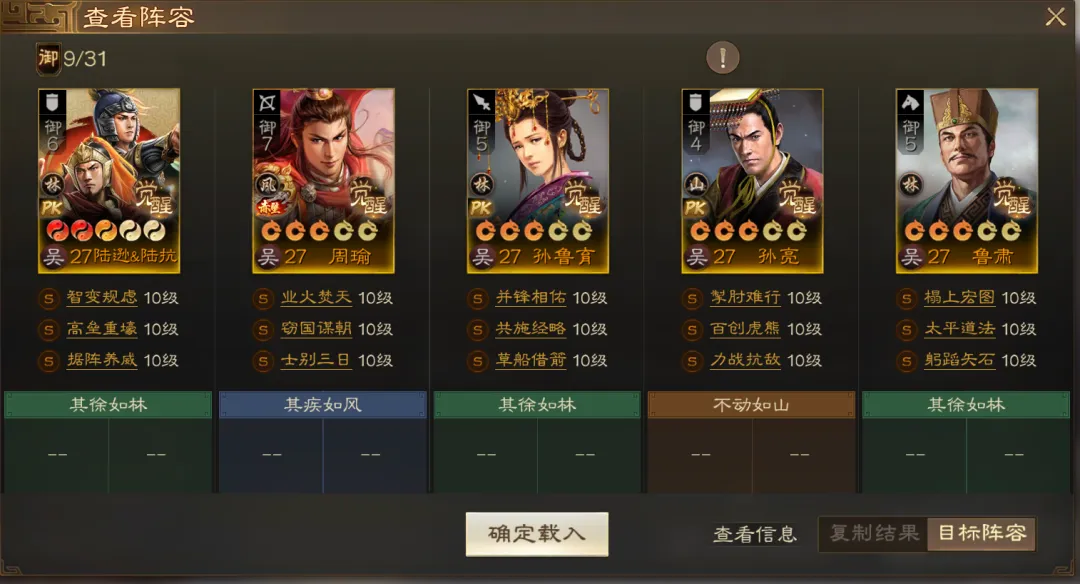 孙鲁育替代于禁,双头怪在五本27御后可以上位替代廖化(需要3阶及以上战法才行,没有继续用廖化),这个组合伤害高,孙鲁育的扛揍能力也不错,相对比较稳定的组合。其中双头怪也可以换SP甘宁(高垒重壕+难知如阴),伤害更高,但相对比较脆。