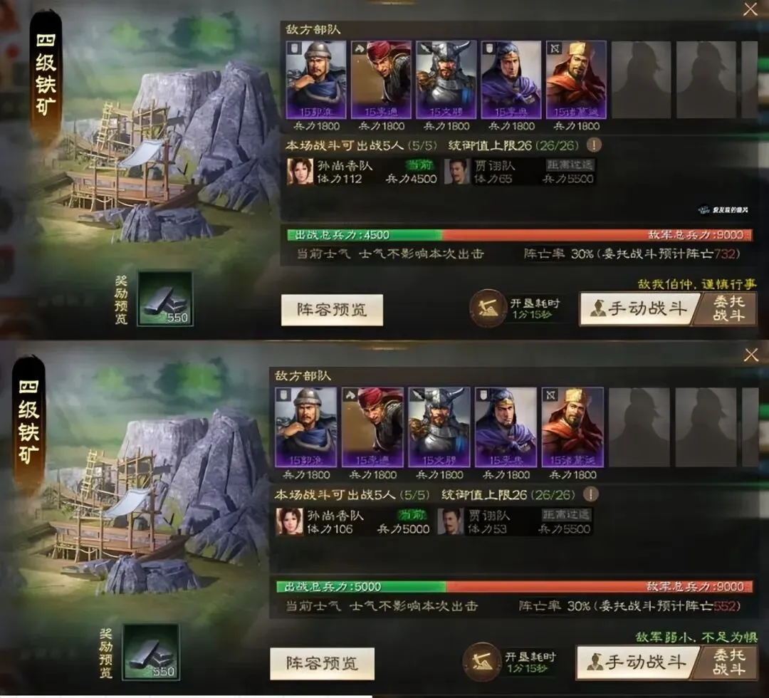 由于现在有兵损记录功能,打同等级的贼寇,只要手操一次,然后别换战法,之后就可以自动扫荡了,战损不会超过你手操的这一把的战损(零损除外,这个记录功能有保底战损,如果是零损的话会给你最低限度的兵损)。