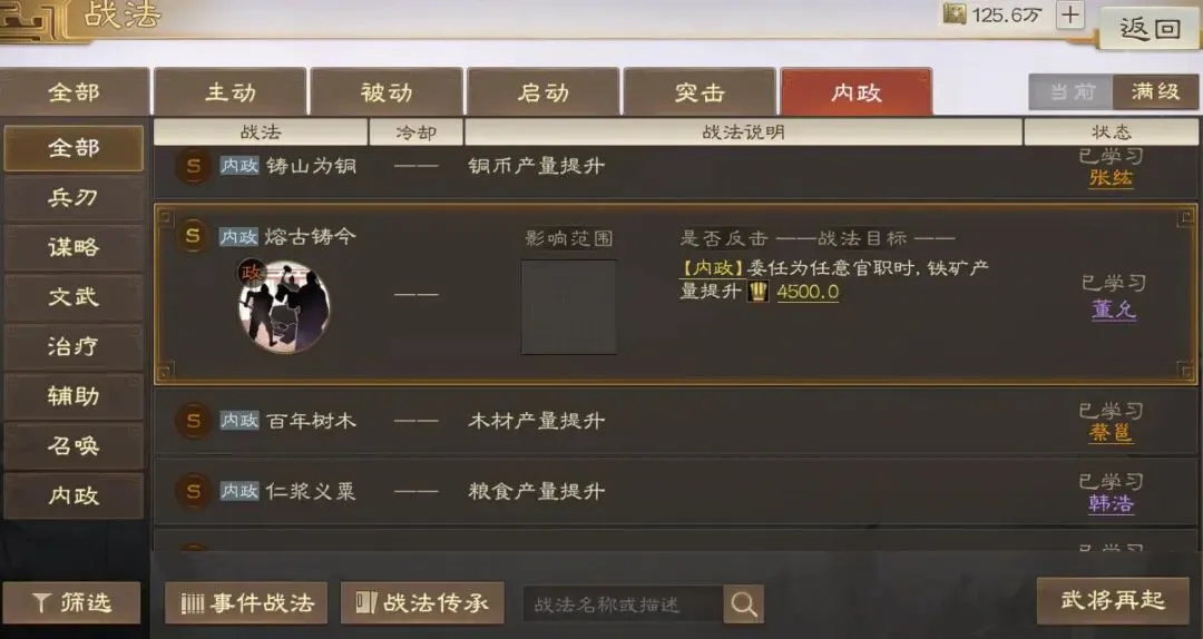 *有很多事件战法里面换的S级内政战法,只要求委任为任意官职时就能发挥效果,如果你这些战法比较多的话,可以把像军械坊、市场这种建筑提升到能开内政官的程度,把这些战法给政治高的内政武将带就行。