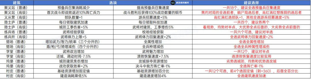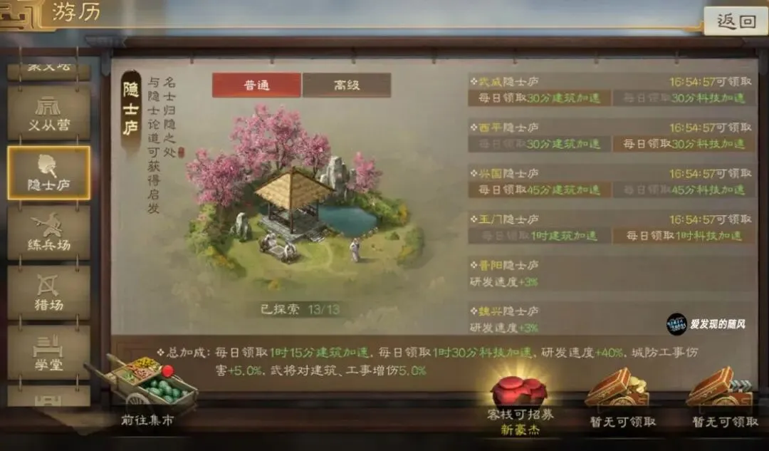 大地图游历的各种建筑物也是和之前一样,可以自己选想要什么了。比如隐士庐,可以选择领取建筑加速还是科技加速,可看表格参考选什么: