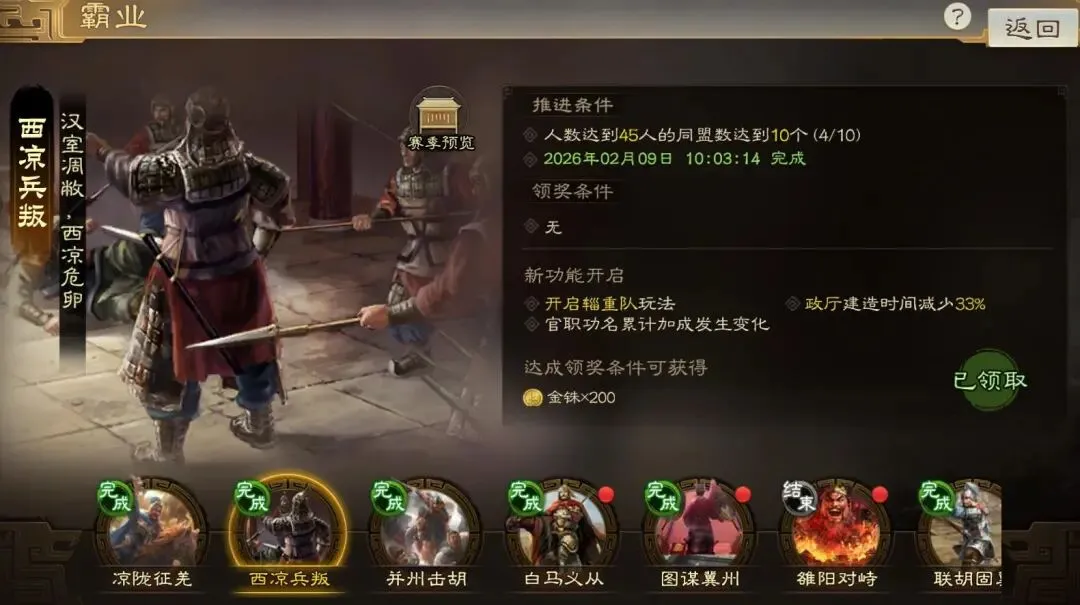 从第二个霸业事件开始,就会有减少政厅建造时间的新功能开启,在升本的时候最好注意一下时间,卡在霸业事件刚完成后升是收益最大的,用加速也等事件后再用,不然会浪费大量加速时间。