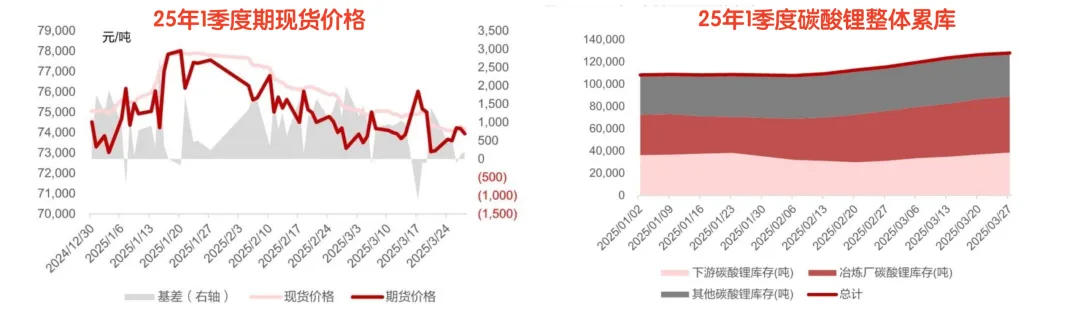 进入25年一季度,受春节前锂盐厂检修、物流紧张及莫桑比克贝拉港发运受限等因素影响,市场供应预期偏紧,价格震荡上行。然而节后,市场供需格局发生明显转变。供给端呈现强劲弹性,锂盐厂复产进度超预期,到2月下旬周度产量环比增幅达17.47%,创下历史新高。反观需求端虽然政策面持续释放利好,比如公务用车采购新能源车比例要求、以旧换新政策范围扩大等,但短期受传统淡季影响,终端市场需求复苏缓慢。综合以上情况,由于供给并未有效减少,需求转暖预期未兑现,导致碳酸锂价格震荡回落。