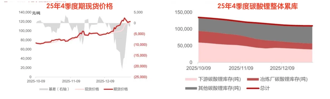 四季度淡季不淡,需求强劲驱动锂价整体呈震荡上行格局。季度均价环比三季度明显抬升。季度末价格强势站上120000万/吨,较2025年低点几近翻倍。供给端并未出现三季度的停产限产新故事,反而有不少新建产能投产。但此时三季度的停产限产迎来影响,尤其宁德枧下窝停产,对锂价的上行形成了强力心理支撑。锂盐厂也敏锐觉察到锂价见底信号,纷纷捂货惜售,进一步推高了锂价。碳酸锂库存的持续去库,也加剧了市场对碳酸锂价格上涨的预期。