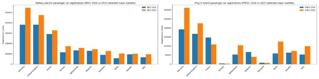 BEV:“全面增长、头部集中、部分市场爆发” PHEV:“分化明显:有的猛涨、有的明显退潮” 西班牙增速最抢眼,其2025年销量几近翻倍