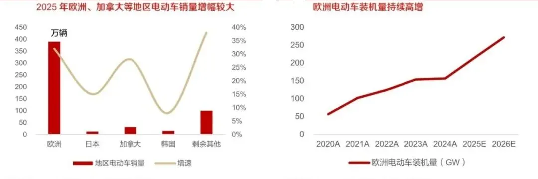 2025年欧洲电动车市场持续增长,销量约389万辆、同比约+32%,渗透率约17%(仍显著低于中国,长期空间大)。 2026年展望:全球电动车仍增长,但区域分化更明显——中国稳增长、欧洲修复增长、其他地区推进相对缓慢;中国2026销量增速预计约21%,欧洲预计仍有20%+增长。