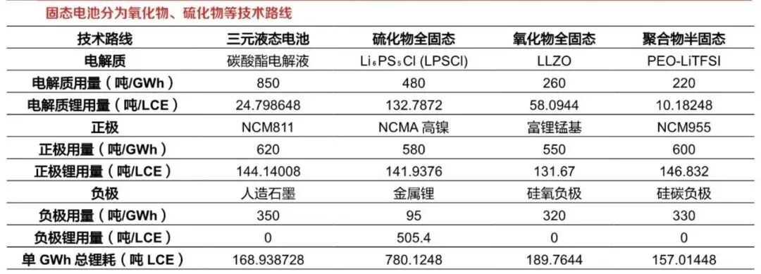 2025-2026是固态电池中试线集中落地窗口期,虽然短期装机规模有限,但技术路线一旦确立,会改变单位GWh对应的锂需求强度。固态电池并非一定“节锂”,部分路线可能显著提高单位电池容量的锂消耗强度,因此其对锂需求的边际拉动或被低估,可能带来板块估值重估。目前硫化物路线有较多电池厂采纳,而其单GWh锂耗也最高。
