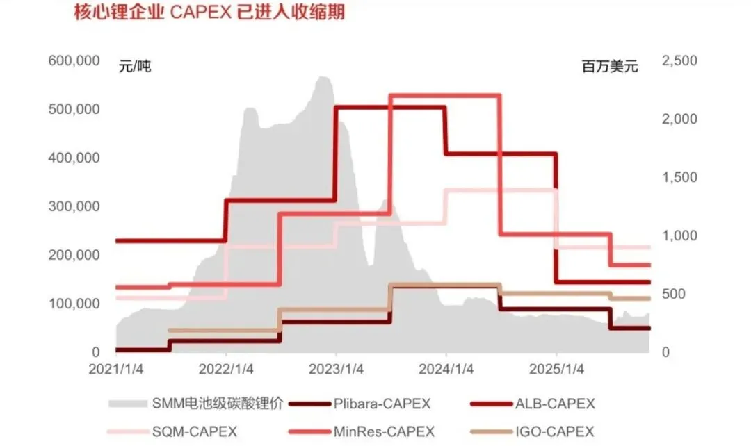 2026年新增供给净增约44.8万吨LCE,并呈现“新投产为主、海外增量有限、国内锂矿开始放量”的特征。而更重要的是“供给刚性”来自CAPEX:锂企资本开支对锂价存在滞后性,因为锂价2022见顶后,CAPEX 反而在2023-2024见顶,随后随着锂价两年磨底,多家企业下调资本开支计划,核心锂企 CAPEX 进入收缩期,使得未来供应更具结构性刚性。