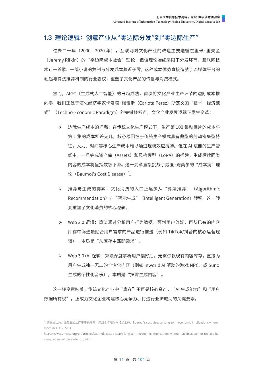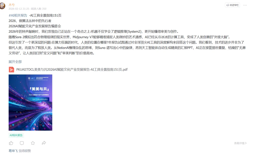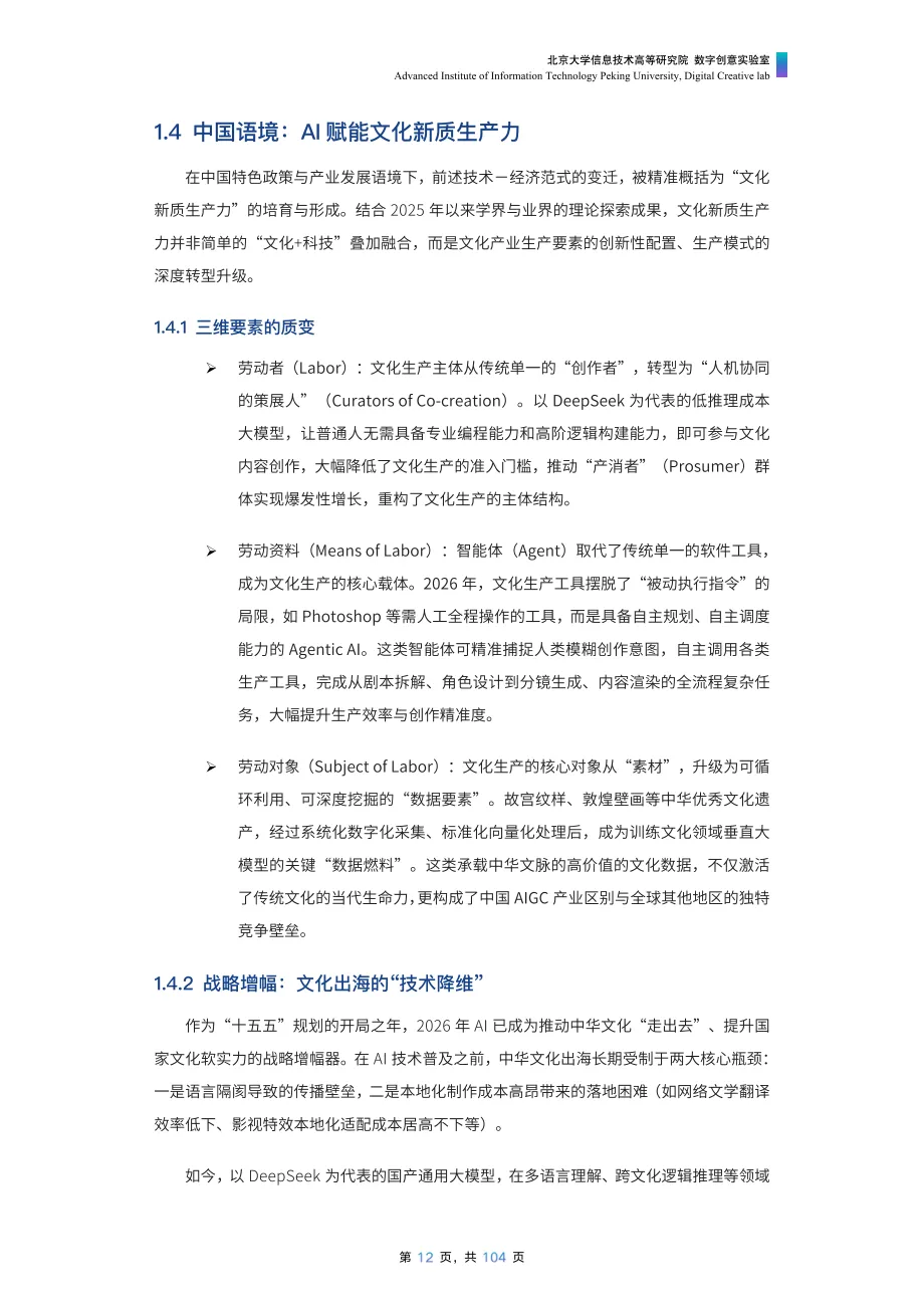 《美美与共:2026 AI赋能文化产业发展报告》由北京大学信息技术高等研究院数字创意实验室发布,报告由《AI创意业态透视》与《AI工具全景指南》两部分构成,分别从理论框架与实践工具切入,为行业提供体系化参考。·《AI创意业态透视》以 AI 创意业态为核心视角,系统剖析了 AI 从文化产业辅助工具升级为核心基础设施的变革进程,解答了零边际成本时代文化产业核心竞争力的关键命题。