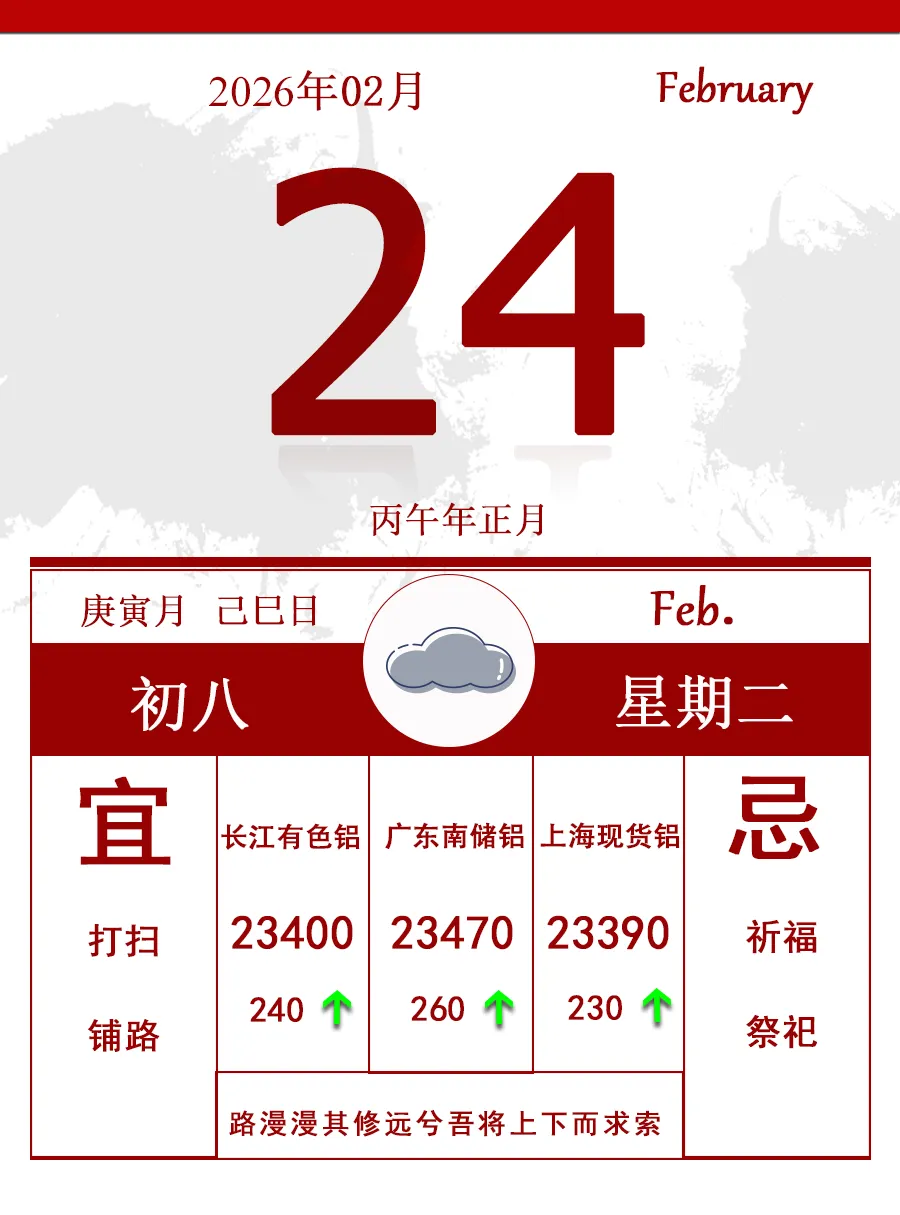 今日是马年第一个交易日,现货铝价格较节前上涨230点到23390。春节长假期间,伦铝意外的安静如鸡,到昨天为止的点位与节前几乎平收,失去了参考意义。而假期中美伊局势持续紧张以及特朗普与美最高法院关于关税战合法性的撕扯推高了贵金属和石油的价格,利多今日有色和化工板块的开盘,今天沪铝一改节前破位下跌段走势,跳空高开,午后盘面接近上涨400多点到23600一线,返回到小时中轴上方,不过短期上涨的势头能否得以延续还很难说,维持震荡的可能性居高。