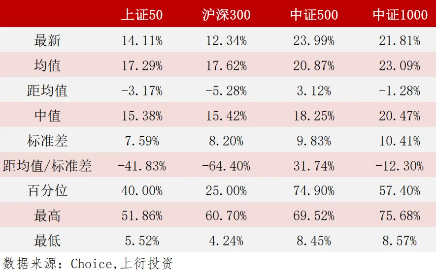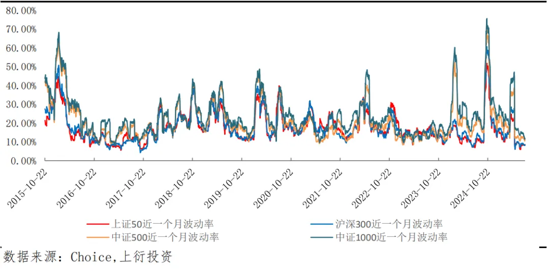 上周上证50、沪深300、中证500、中证1000一个月历史波动率均处于偏低水平。期权隐含波动率方面,50ETF、300ETF、1000股指期权隐含波动率有所回落。