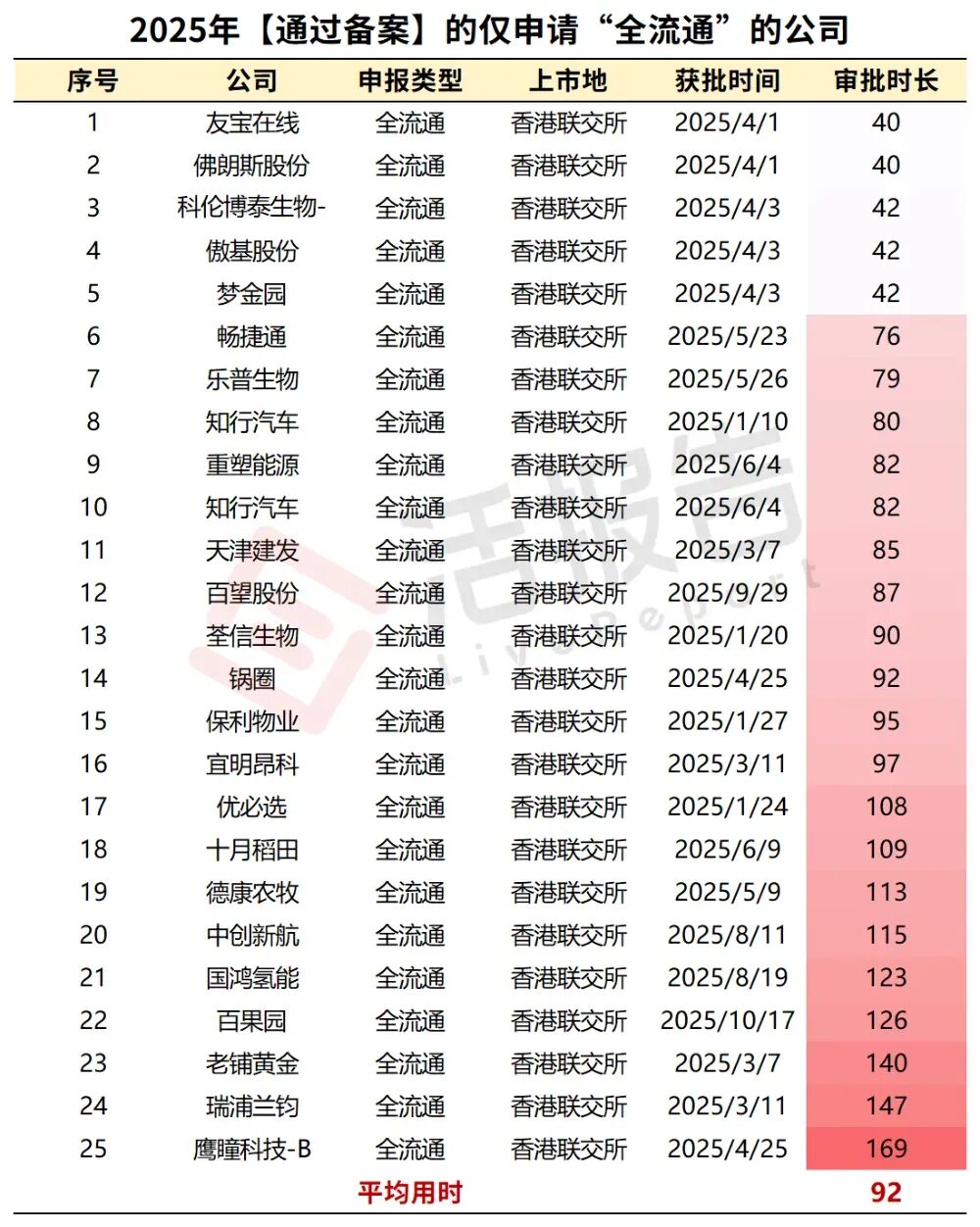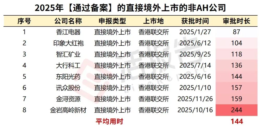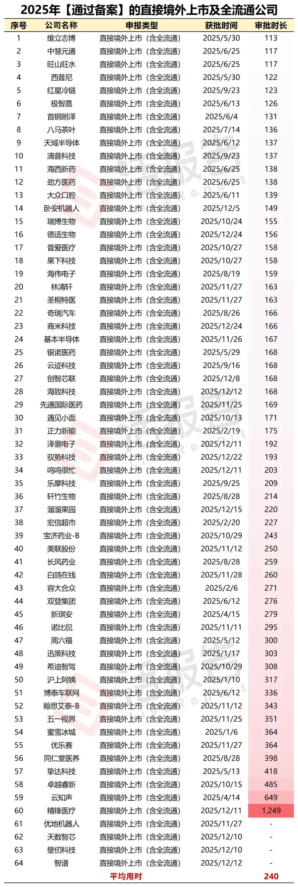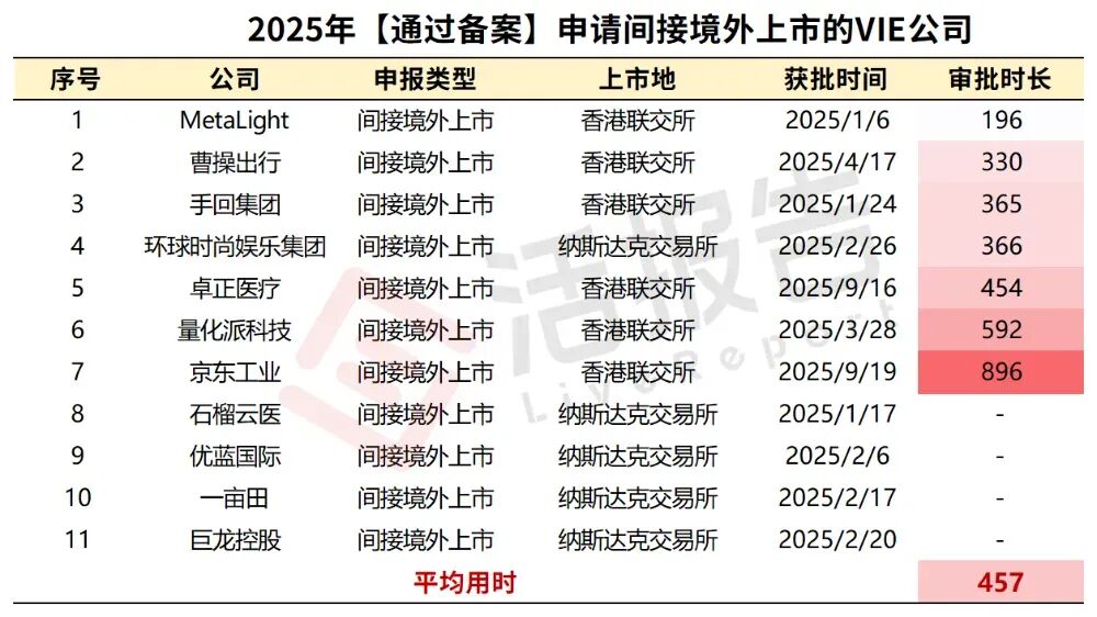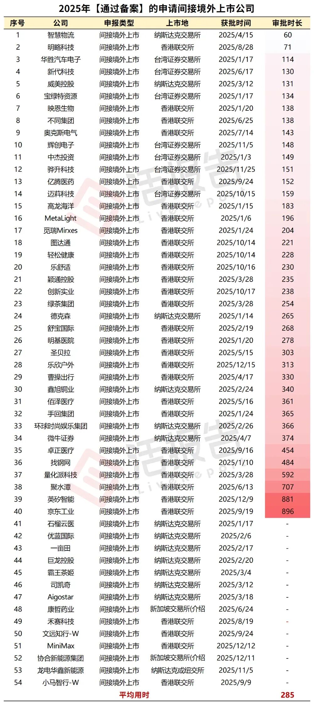 来源:节选自《2025年香港IPO市场及二级市场白皮书》想知道选哪种上市路径更“快”?这篇文章用数据拆解了直接境外上市、间接境外上市与“全流通”在备案审批时长上的差异,帮助IPO企业评估你需要的时间与合规投入。根据《2025年香港IPO市场及二级市场白皮书》数据显示,2025年通过备案的境内企业一共187家,相比于2024年的157家同比增长约19.1%。而不同的上市架构在审批时长上差异显著。间接境外上市(尤其是VIE架构)通常更耗时,直接境外上市或单纯申请“全流通”方案则更快通关。这背后的逻辑并非偶然:VIE架构涉及复杂的合同安排、对境内外法律适用的审查更严格、且常常要解决实际控制权日后执行效力的问题,因此监管层会花更多时间核验合同的稳健性与风险缓释措施。2025年以直接境外上市的申报方式通过备案的非AH企业有8家,平均审批时长为144天。审批最快的为香江电器,历时87天;审批时长最久的为金岩高岭新材,历时244天。2025年以直接境外上市(含全流通)的申报方式通过备案的企业有64家,平均审批时长为240天(秘密递表除外)。审批最快的为维立志博,历时113天;审批时长最久的为精锋医疗,耗时长达1249天。2025年以仅申请H股全流通的申报方式通过备案的企业有25家,平均审批时长为92天。审批最快的为友宝在线,历时40天;审批时长最久的为鹰瞳科技-B,耗时169天。2025年以间接境外上市的申报方式通过备案的企业有54家,平均审批时长为285天(秘密递表除外)。审批最快的为智慧物流,历时60天;审批时长最久的为京东工业,耗时896天。2025年以间接境外上市的申报方式通过备案的VIE架构企业有11家,平均审批时长为457天(秘密递表除外)。审批最快的为MetaLight,耗时196天;审批时长最久的为京东工业,耗时896天。IPO企业在选择上市路径时应把“时间容忍度”作为核心决策变量。若业务成长与募资窗口时间敏感,可优先评估那些审批可预见性更高的路径;若企业更关注长期治理与资本运作灵活性,或者业务本质涉及国内外复杂监管,接受较长审批周期并在前期投入更多合规准备,往往是更稳妥的选择。(本文首发于活报告公众号,ID:livereport)